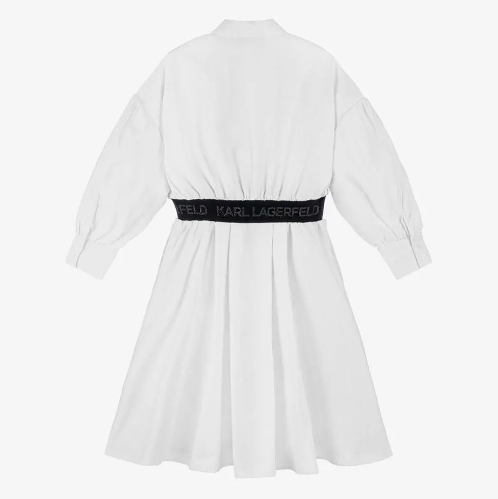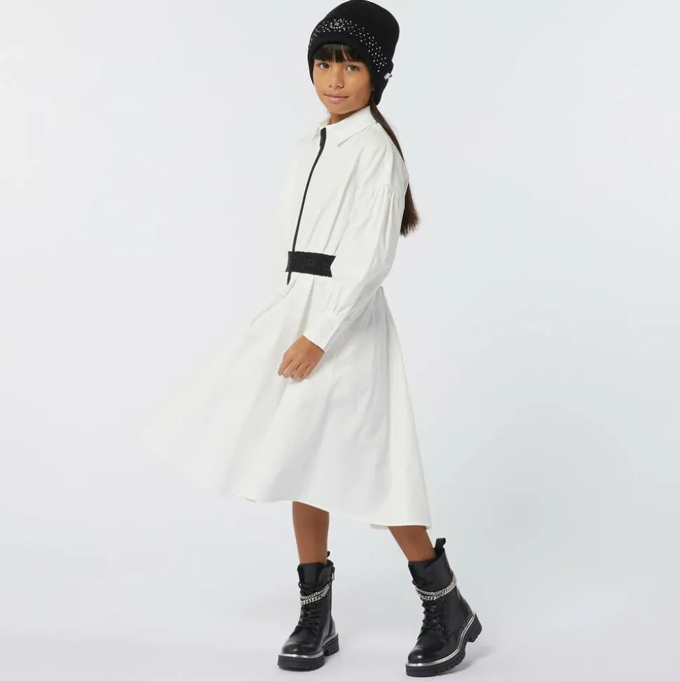 Designed by KARL LAGERFELD KIDS, this white dress for girls is made from comfortable, cotton-blend twill. In a cool shirt style, it has a pointed collar and dropped-shoulder puffed sleeves with buttoned cuffs. Fastening with an exposed black zip on the front, it has an elasticated waistband with sparkly jacquard logos for an added branded touch. The flared skirt has pleated detailing on both sides and discreet pockets hidden in the side seams.