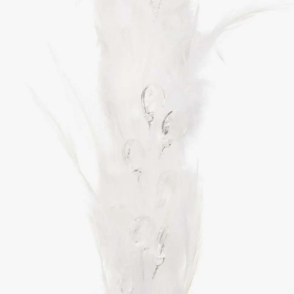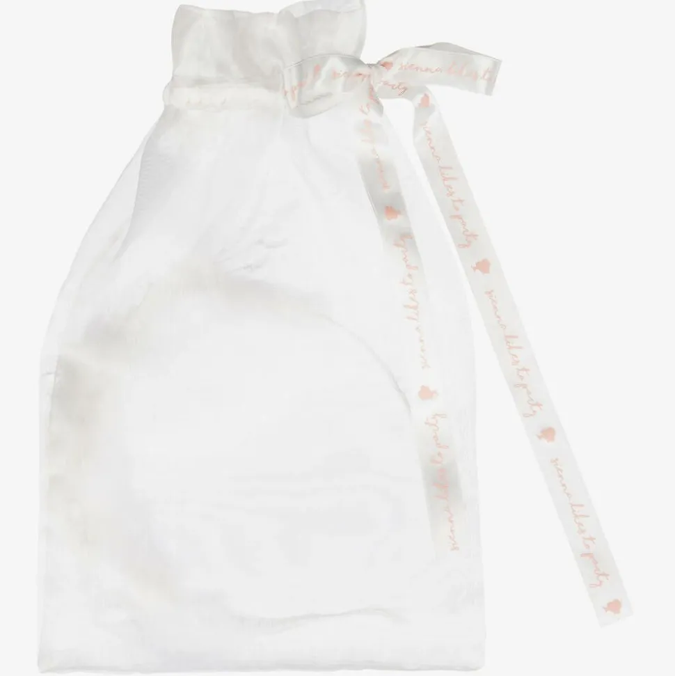 Girls pretty white handmade hairband by Sienna likes to party. The band is covered with white satin ribbon and it has soft white feathers and clear beads.