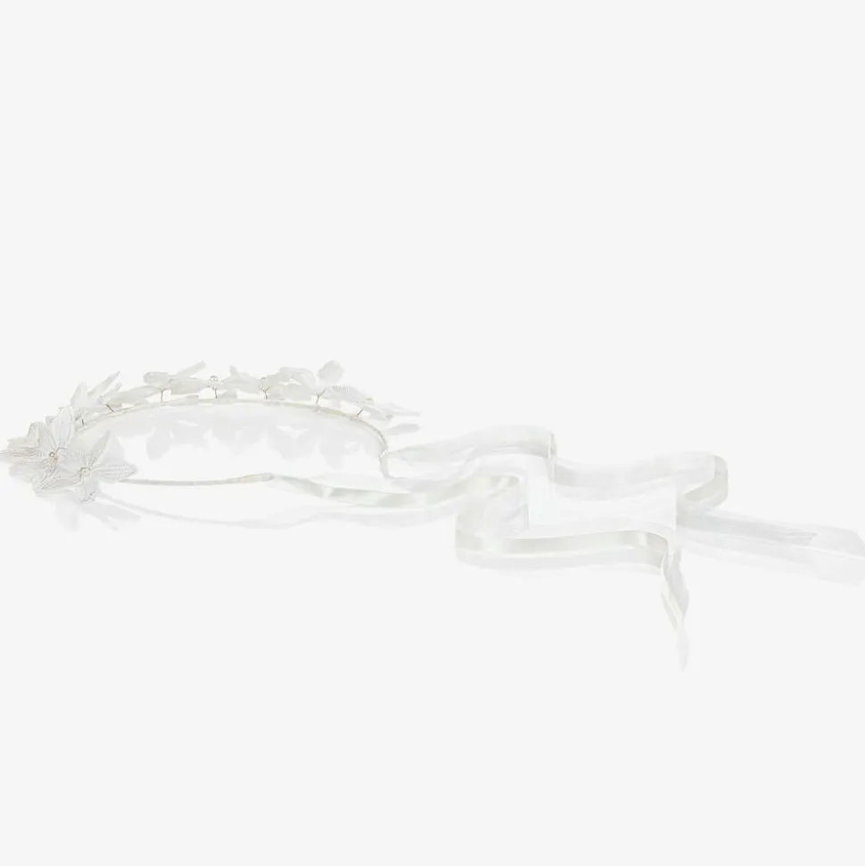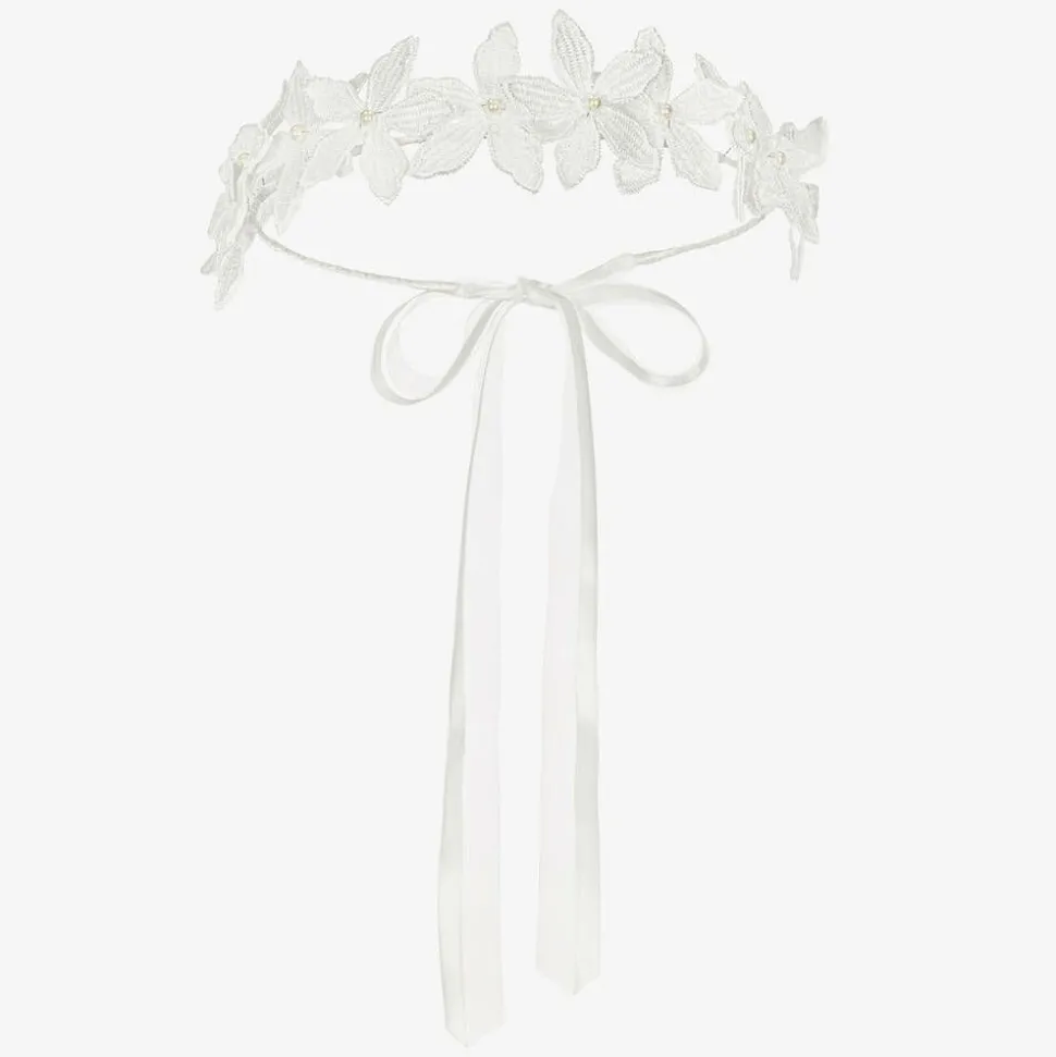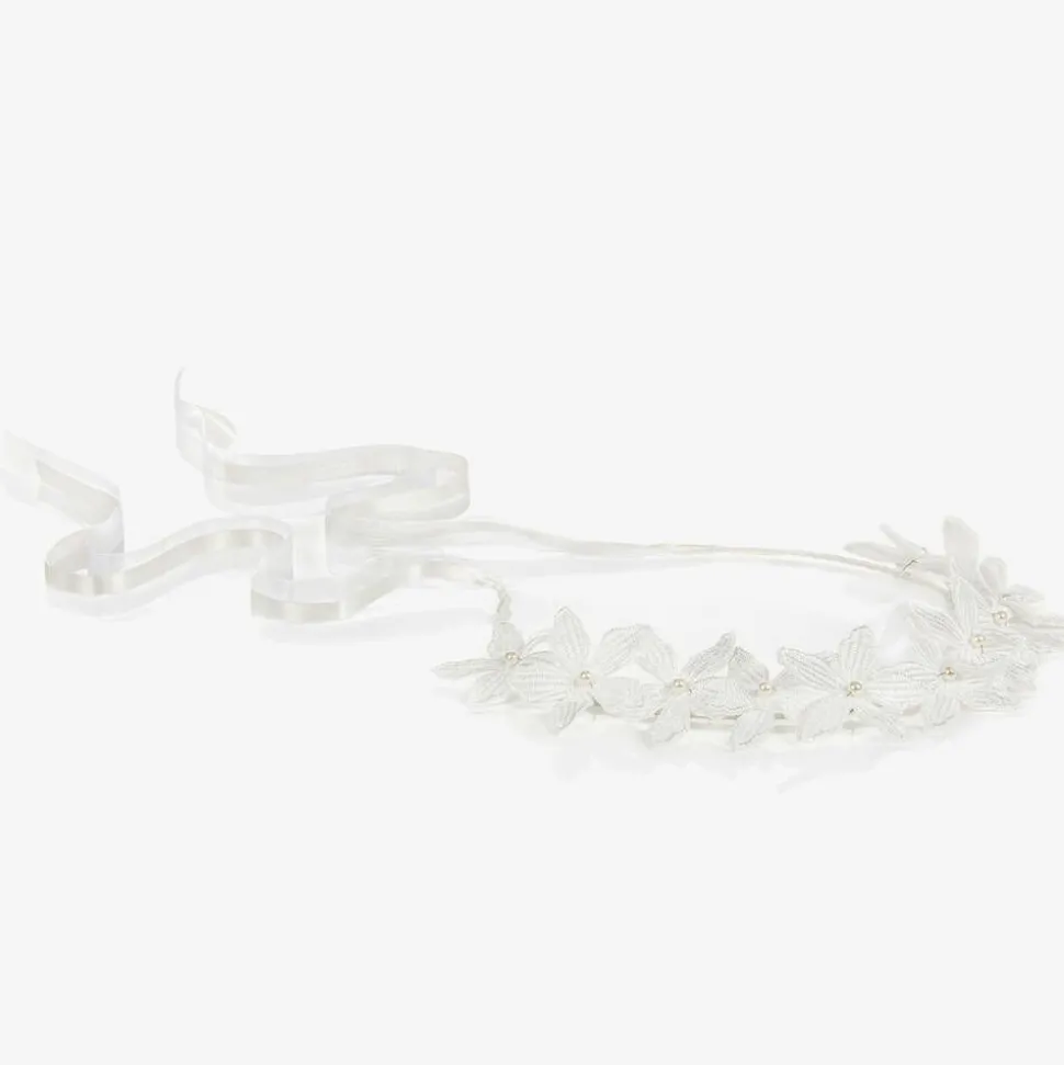 Beautiful handmade garland of white embroidered flowers for girls by Sienna likes to party. An ideal accessory for bridesmaids and other celebrations, it has an adjustable satin-wrapped halo and gorgeous pearl bead details. It is secured with ribbon ties which will trail slightly down the back for a lovely effect.