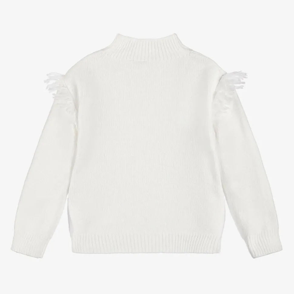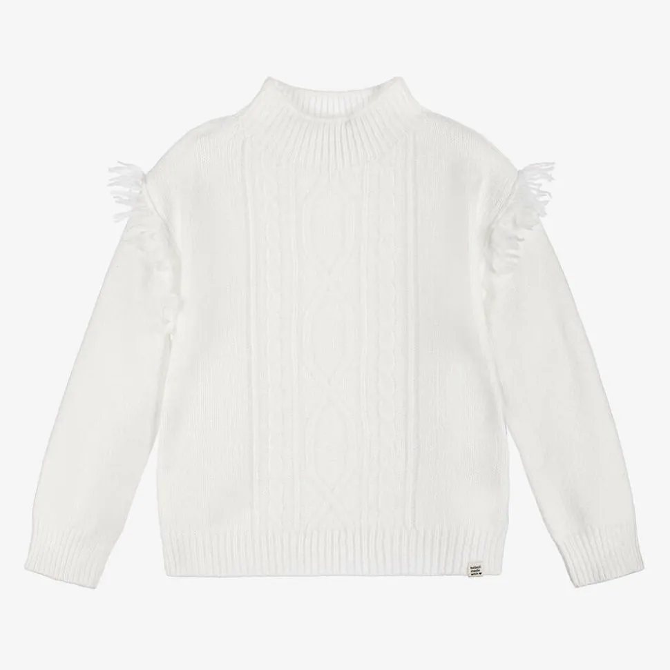 A beautifully soft white jumper for girls by Spanish brand, Boboli. Designed with a cosy turtle neck, it is knitted with a stylish cable pattern on the front and has fun fringing on the dropped shoulders. A branded tab on the front hem adds a discreet designer touch.