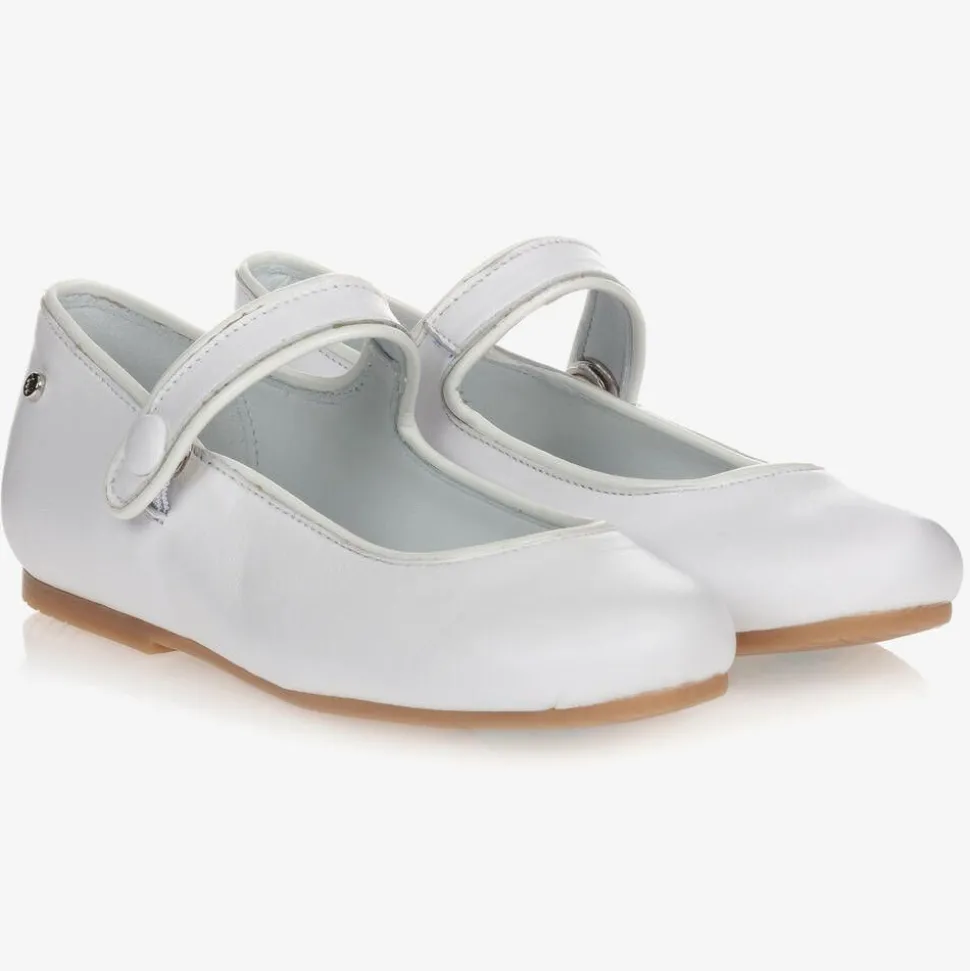 Girls white ballerina pumps by Manuela de Juan, handmade in soft leather. In a pretty Mary Jane style, they have a soft leather lining, popper fastening and a rubber sole.