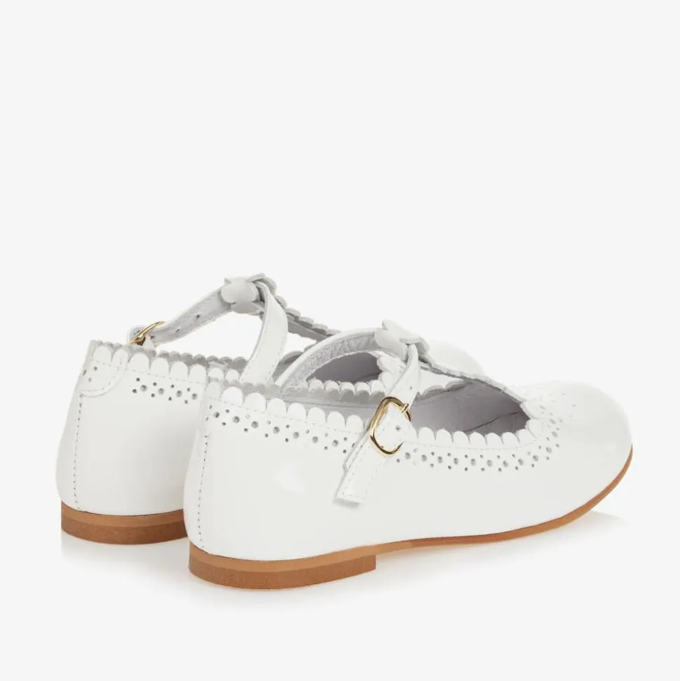 Shiny white T-bar shoes for girls by traditional British brand Beatrice & George, exclusive to Childrensalon. Made in soft, supple, patent leather, they are patterned with pretty perforations and have sweet scalloped trims. There is an adjustable ankle strap, fastening with a gold-tone buckle and a cushioned insole for comfort.