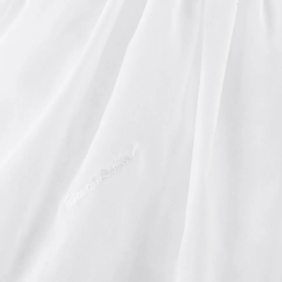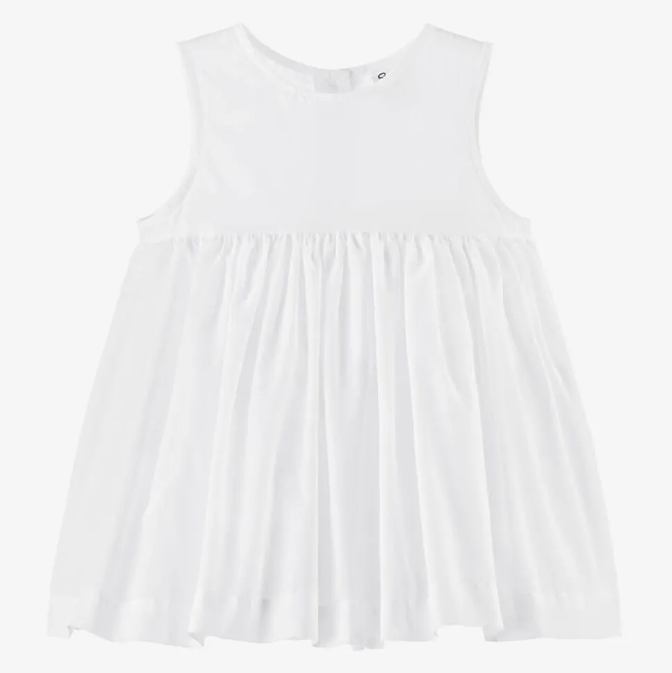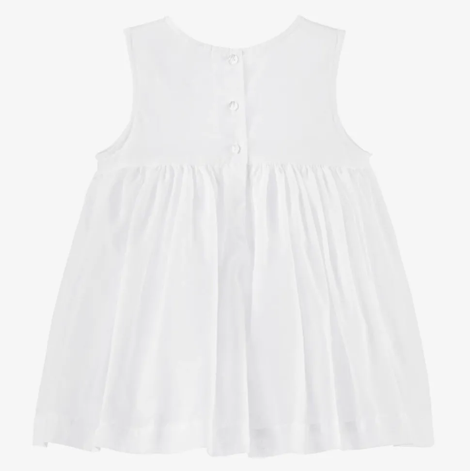 Little girls white petticoat by Sarah Louise, softly woven in a cotton blend. Ideal for adding a fuller shape underneath dresses, this sleeveless style is plain white and fastens with discreet buttons on the back. The voluminous skirt is formed by layers of structured tulle and plain woven fabric.
