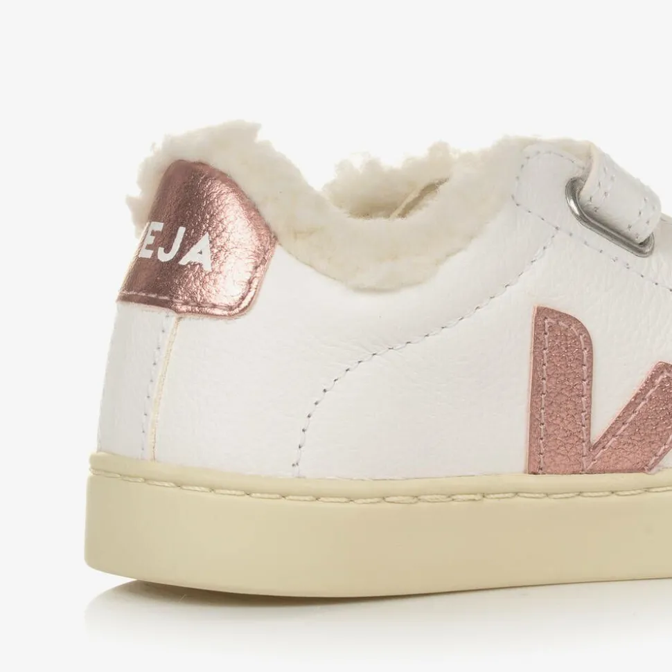 White trainers for girls by French brand VEJA, made in soft ChromeFree grained leather. These cool trainers fasten with velcro straps across the foot and have the brand's signature 'V' logo in metallic pink on the sides and a white and pink logo on the heel. They are lined in cosy fleece and have non-slip outer soles made from Amazonian rubber.