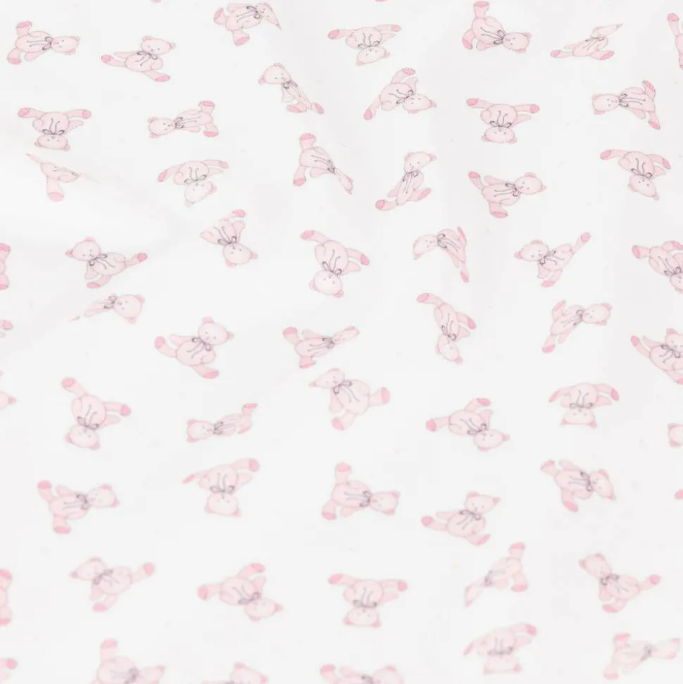 Sweet white and pink blanket for baby girls by Magnolia Baby, made in luxuriously soft Pima cotton jersey. Ideal for the nursery, this beautifully decorated blanket has charming pink teddy bears all-over and a pink stitched border.