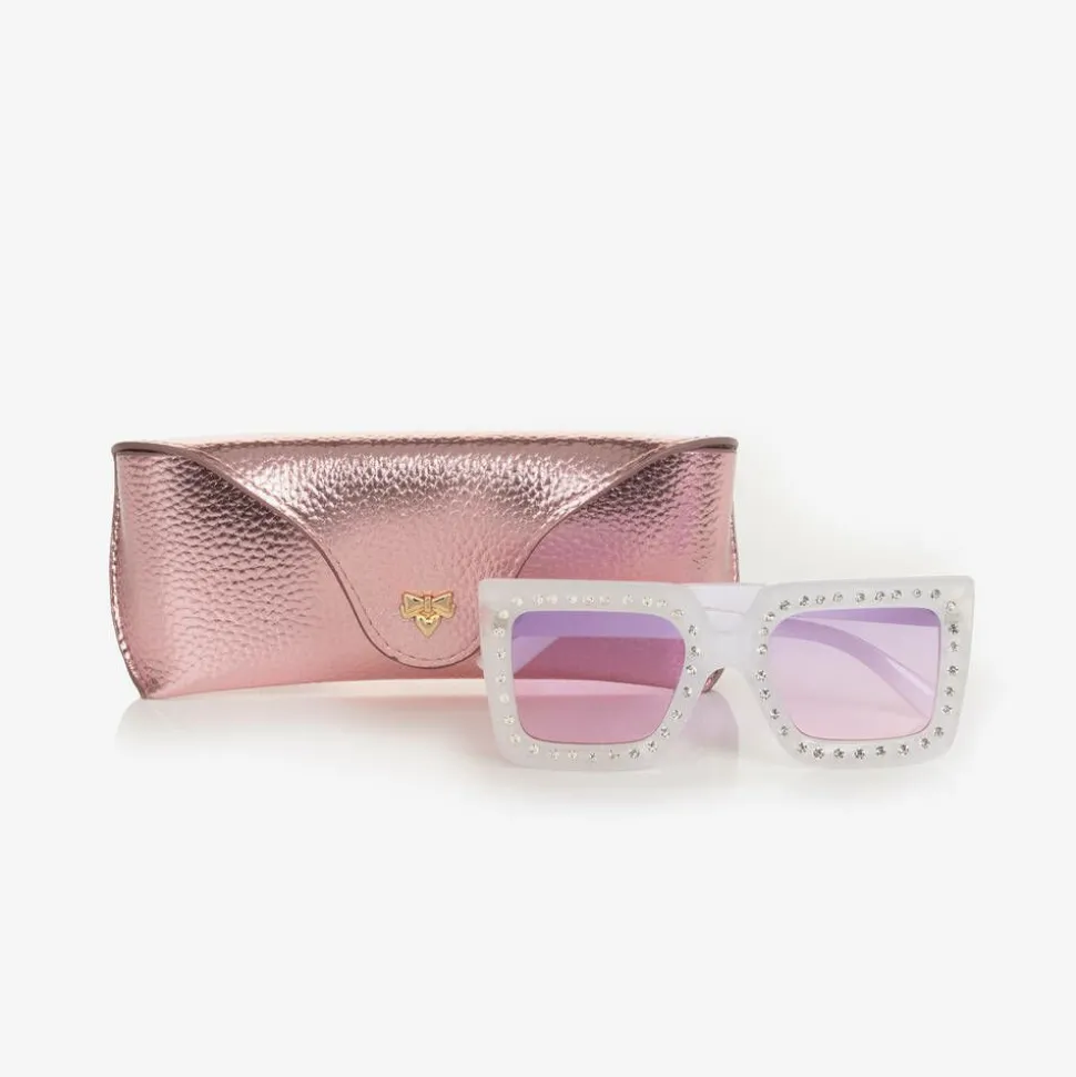 Stylish and fun white sunglasses for girls by Angel's Face, with chunky square frames. Trimmed with sparkling diamanté, they have purple-tinted lenses and are finished with gold logo prints on the arms.