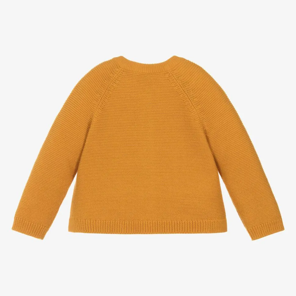 In a lovely shade of mustard yellow, this long-sleeved cardigan for little girls is by British brand Frugi. Made from a soft organic cotton knit, it has a cute bunny rabbit, mouse, and flower appliqué on the front for a fun look. It fastens neatly with branded buttons and has ribbed trims on the round neckline, cuffs and hemline.