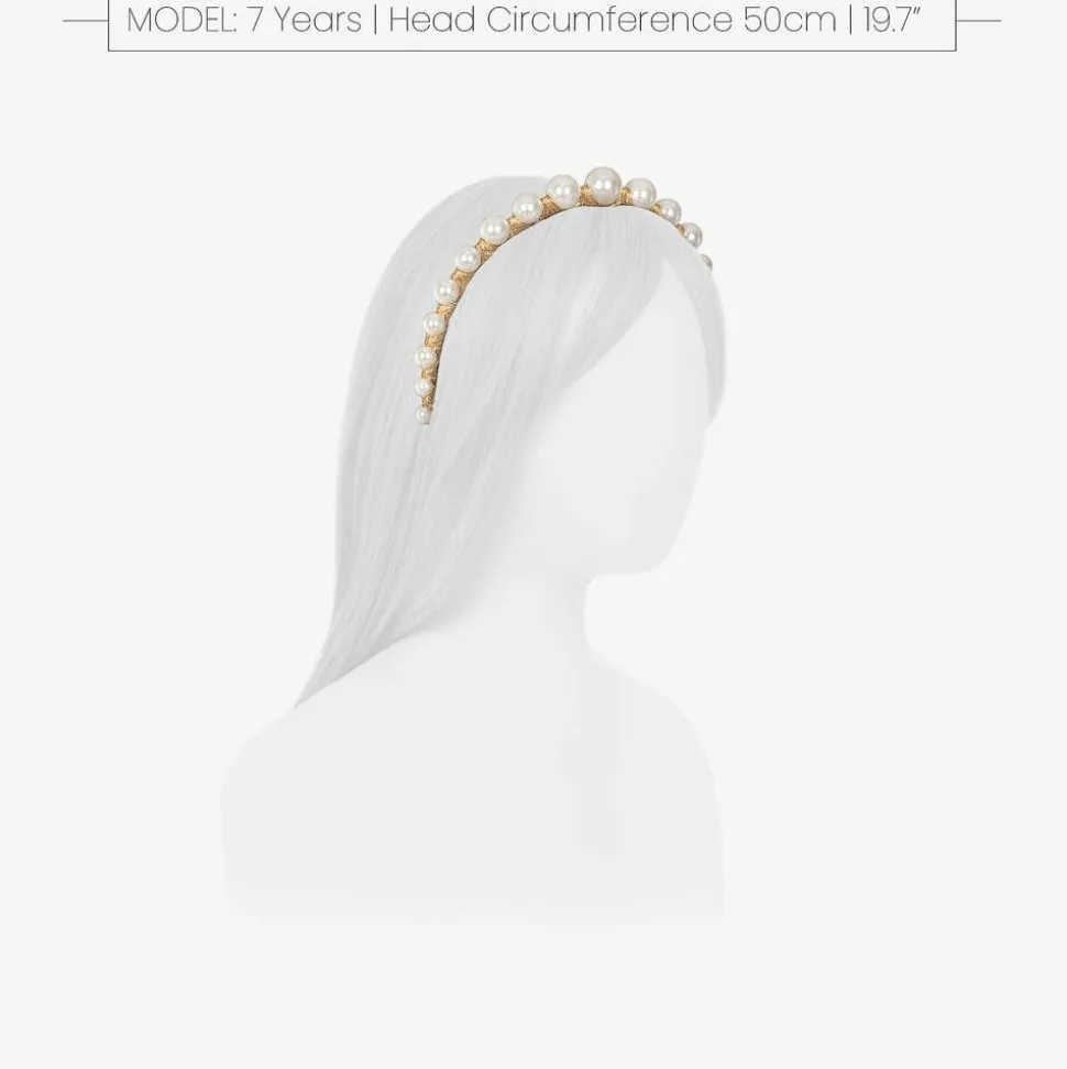 A beautiful metallic gold hairband for girls by Sienna likes to party. Decorated with faux pearls, this handmade 'Vida' hair accessory has a gold satin-wrapped metal band topped with different sized pearl beads.