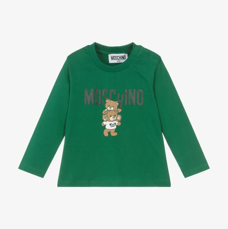 A green long-sleeved top for baby boys and girls by luxury label Moschino Baby. Made from a soft cotton jersey, it is printed with a bold black logo design featuring their iconic Moschino Teddy Bear for a cute branded look. It fastens with poppers on one shoulder and has a stretchy ribbed neckline for added comfort.