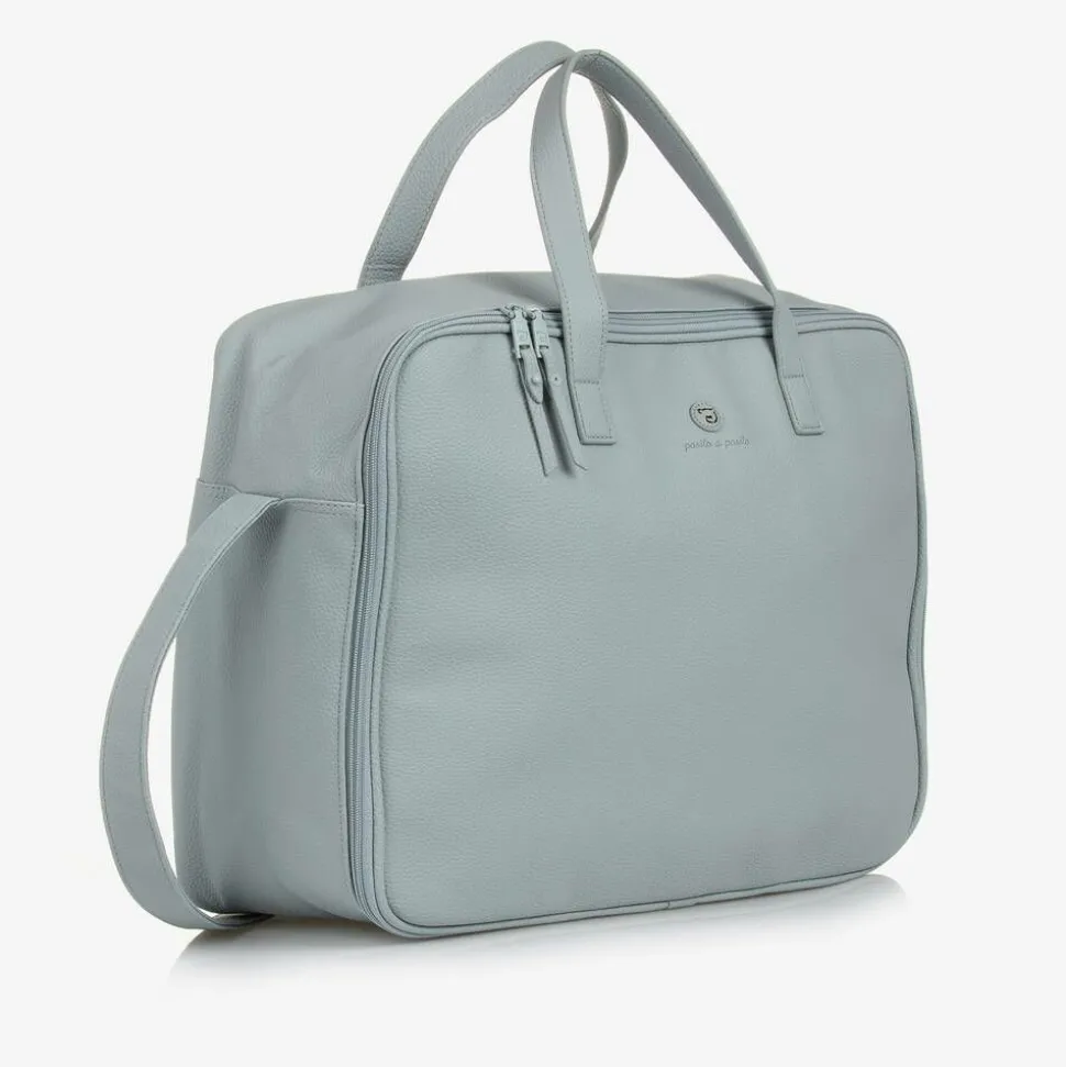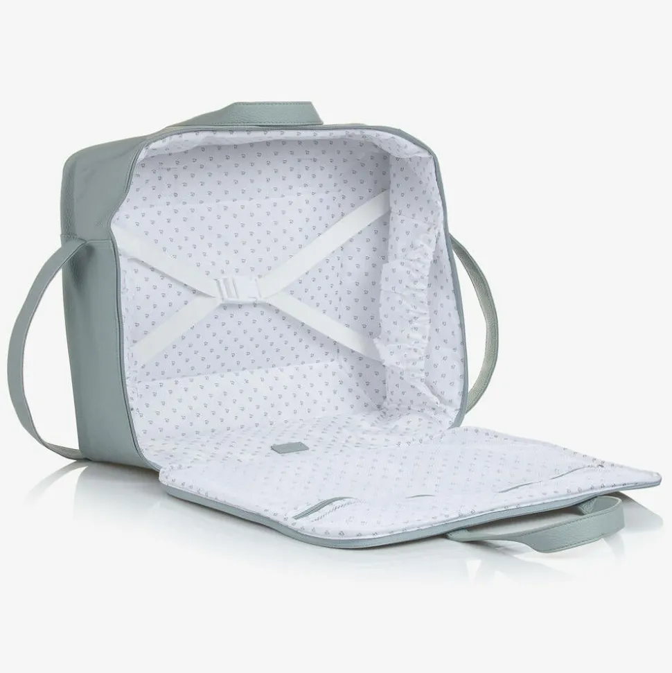 A green suitcase by Pasito a Pasito, made from pebbled faux leather. This large zip-up bag is ideal for hospital or overnight stays, with elasticated side pockets, a zip-fastening mesh pocket and stretchy clip straps on the inside to organise all your maternity essentials. It has easy-to-hold handles and a long strap that fits neatly on a pram.