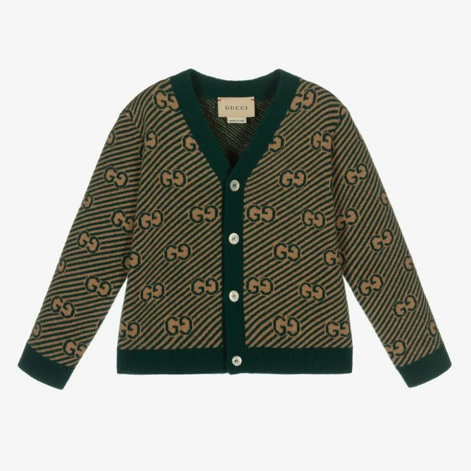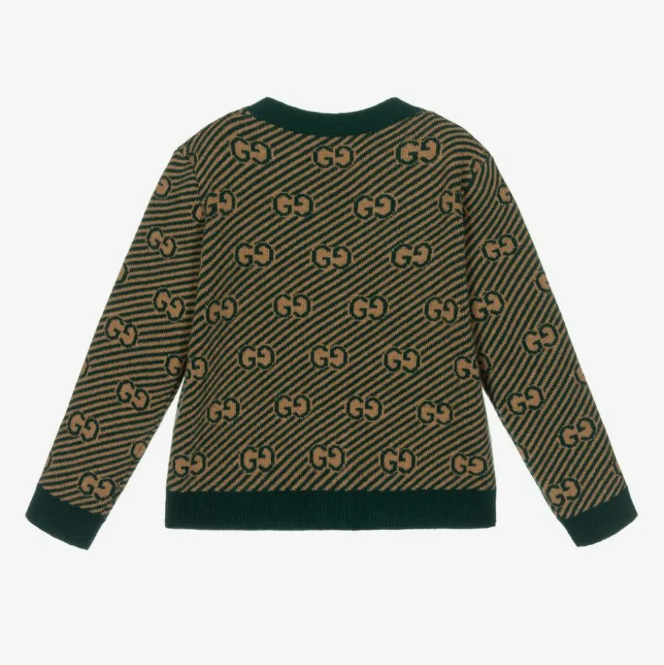 Baby boys and girls green and camel Mini-me wool cardigan by Gucci. Beautifully soft and warm, the jacquard knit has a diagonal GG stripe pattern and there are mother-of-pearl buttons on the front to fasten.