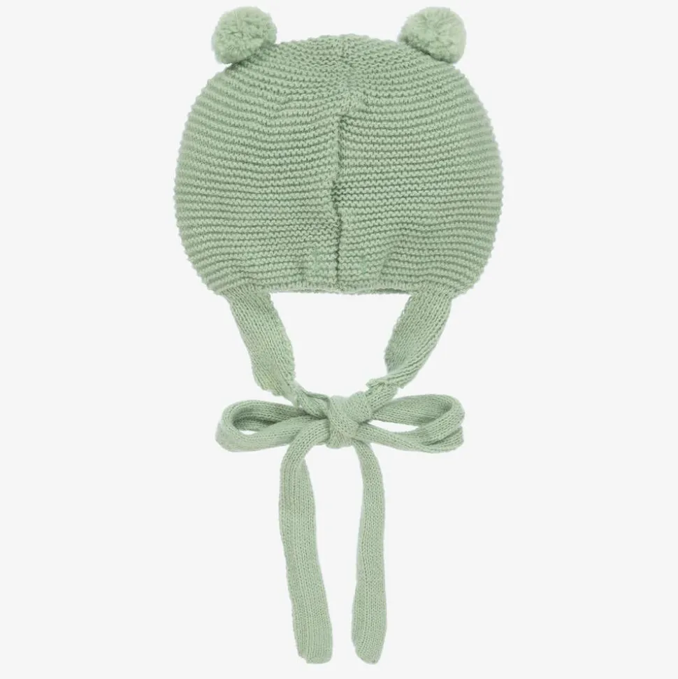 Cute green hat for little boys and girls by Spanish brand Foque, with two small pom-poms on the top. Softly knitted in a garter stitch pattern with a touch of alpaca wool for cosy wear, it has little ear flaps and fastens with knitted ties under the chin.