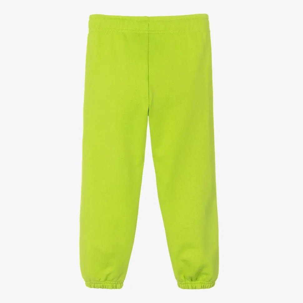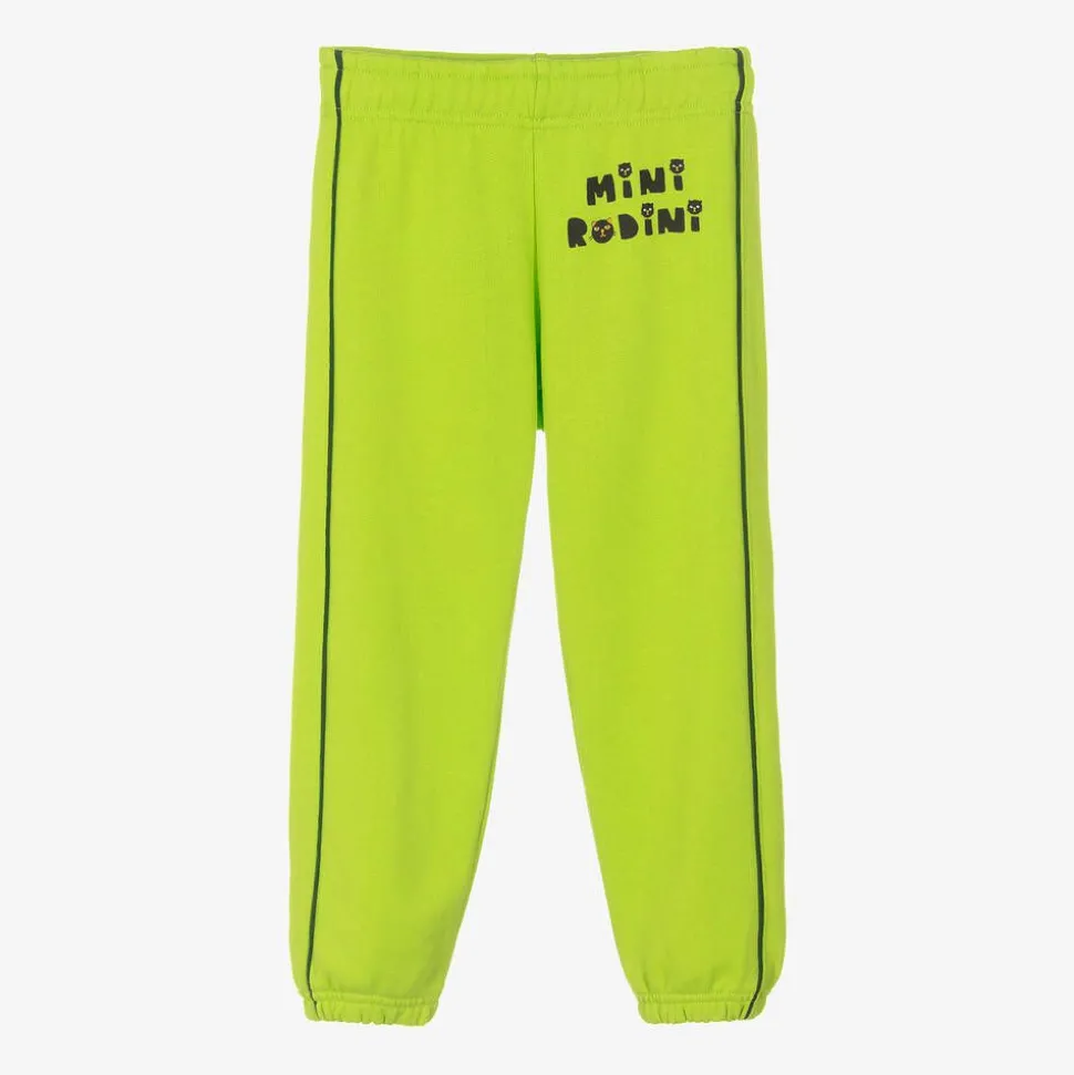 Cool, bright lime green organic cotton joggers for boys and girls by Mini Rodini. Comfortable and casual, they are made in mid-weight, looped-back jersey with elasticated cuffs and an internal drawstring on the waist for a good fit. They have dark green piping trims and a bold black logo printed with cute cats.
