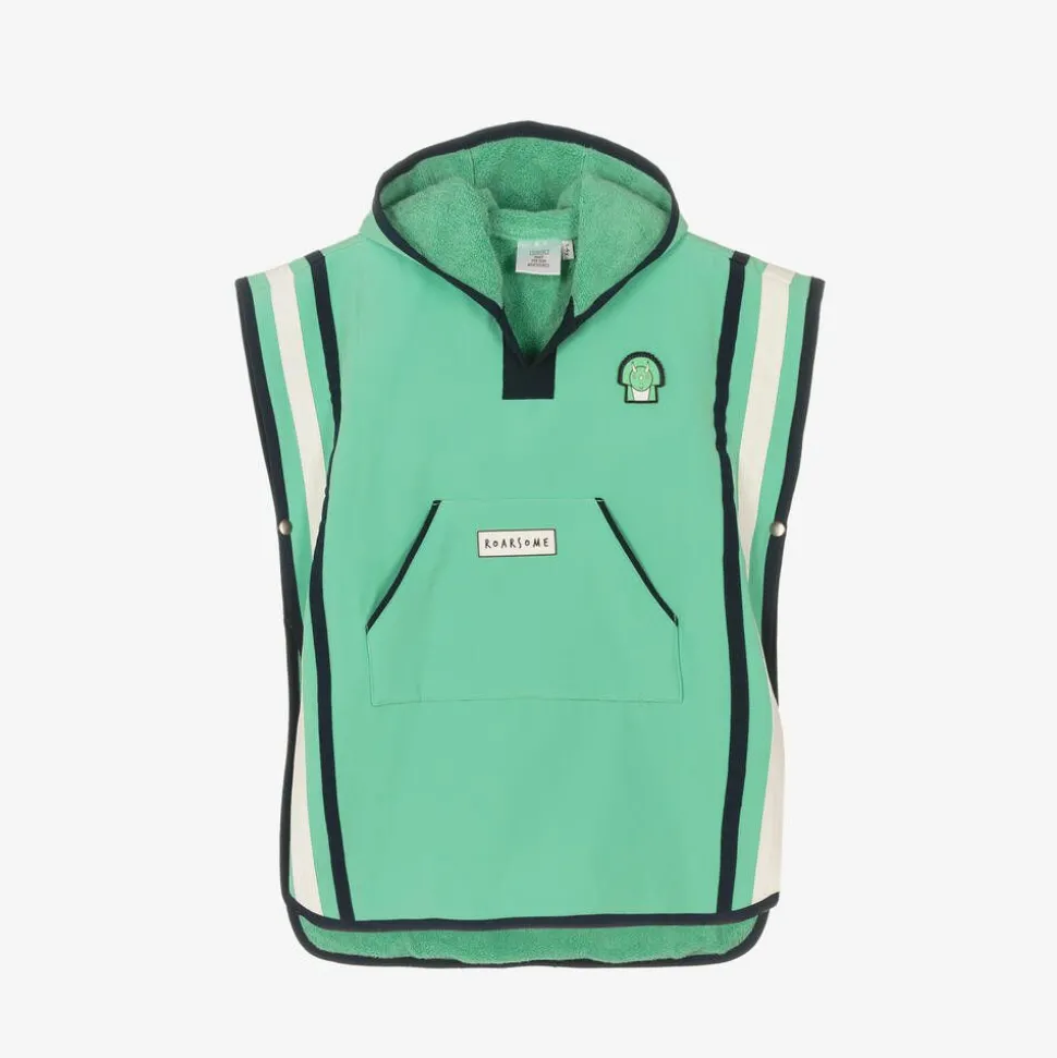 Designed to appeal to children and parents alike, this green hooded poncho towel from British brand Roarsome combines practical features with a look that boys and girls will love. Inspired by the brand's friendly Spike the Dinosaur character, it has a cute rubberised motif on the chest, with fun 3D details on the hood and back. The stylish design features a smooth waterproof outer layer, made from recycled material, with popper fastenings at the side allowing it to be laid flat. A soft, cosy and absorbent cotton towelling lines the poncho and the hand pocket, making it ideal for the beach, swimming pool or bathtime.