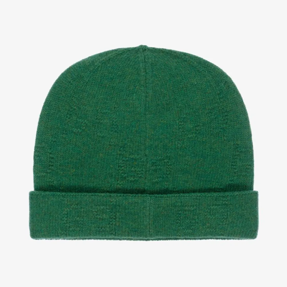 Green wool knit hat for boys and girls by luxury Italian brand Gucci. Soft and fine, it is detailed with the brand's GG logo within the knit as a stylish touch. A beautiful finishing touch to an outfit, it is finished with a traditional turn-up brim
