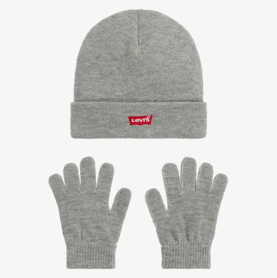 Boys and girls grey knitted hat and gloves set from Levi's. Soft and warm, the hat is made in a double layer with the brand's signature red logo embroidered on the turn-up brim.