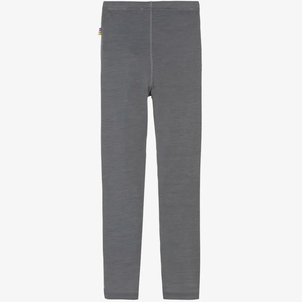 Grey thermal leggings for boys and girls by Joha, made in a soft and stretchy Merino wool and silk blend. Comfortable to wear, these lightweight leggings are ideal for layering under clothes when the weather turns colder. They have a stretchy elasticated waistband and a striped rainbow logo tab stitched on one side seam.
