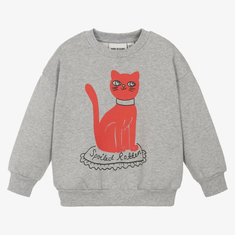 A grey marl jersey sweatshirt for boys and girls by Mini Rodini, made in mid-weight organic cotton. Soft and fleecy on the inside, this layering piece has a comfortable crew neckline and stretchy ribbed trims. Long sleeves with dropped shoulder seams create a more relaxed silhouette. It has a fun red cat print, featuring a 'Spoiled Rotten' slogan on the front and the brand's name on the back.