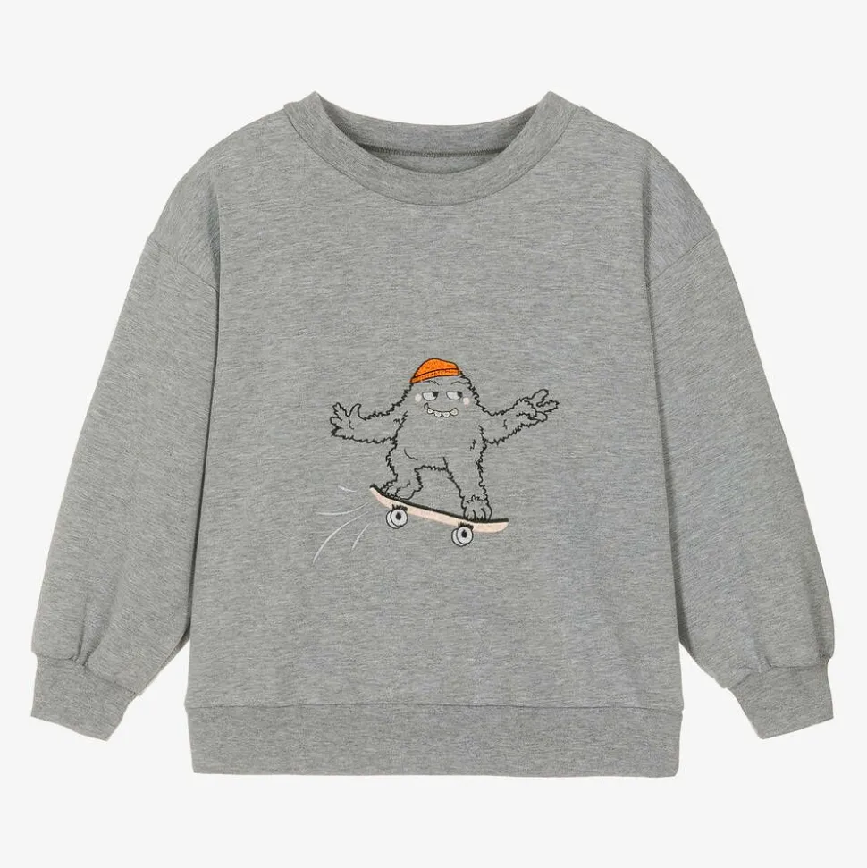 Super cool grey marl long-sleeved sweatshirt for boys and girls by Wauw Capow. Made from soft jersey with a cosy fleecy interior, this relaxed fit top is stitched with a fun skateboarding monster with orange and pale pink embroidered details.