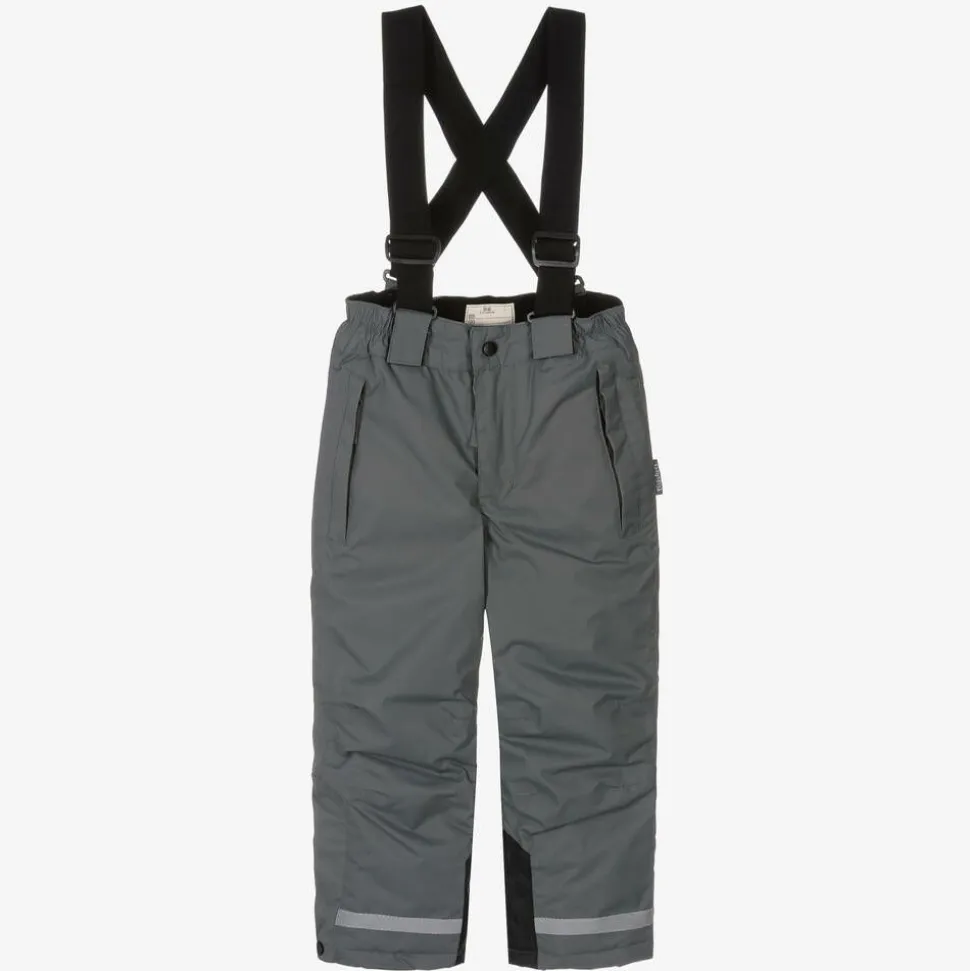 Mid-grey salopettes for boys and girls by Playshoes, with removable and adjustable black elasticated shoulder braces. Lightly padded for optimum warmth without the extra weight, they are also breathable but windproof and waterproof with the taped seams. The waistband and internal gaiters are elasticated to keep snow out and there are cuff zip and popper on the side to help when dressing. There are reflective trims for improved visibility, front zip and popper fastening and two zipped pockets.