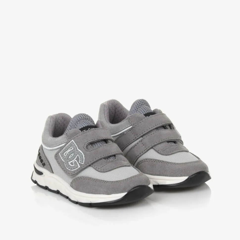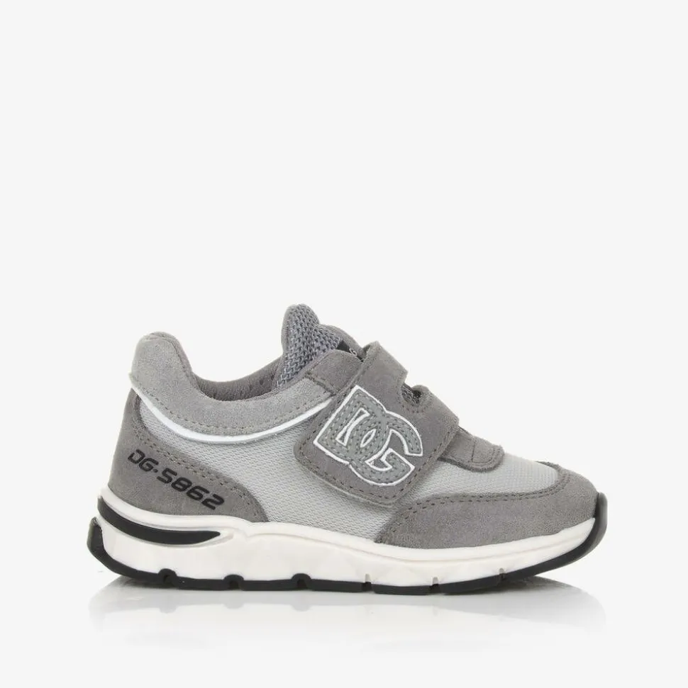 Sporty grey trainers for baby boys and girls by luxury brand Dolce & Gabbana, made in soft mesh with soft suede leather trims. For designer appeal, the easy to use velcro strap features a DG logo appliqué, with further branding on the tongue. A rubberised DG-5862 print can be seen on the side and to ensure comfort, they are lined in soft mesh with a lightly cushioned leather insole. The rubberised outer sole is ridged for improved grip.
