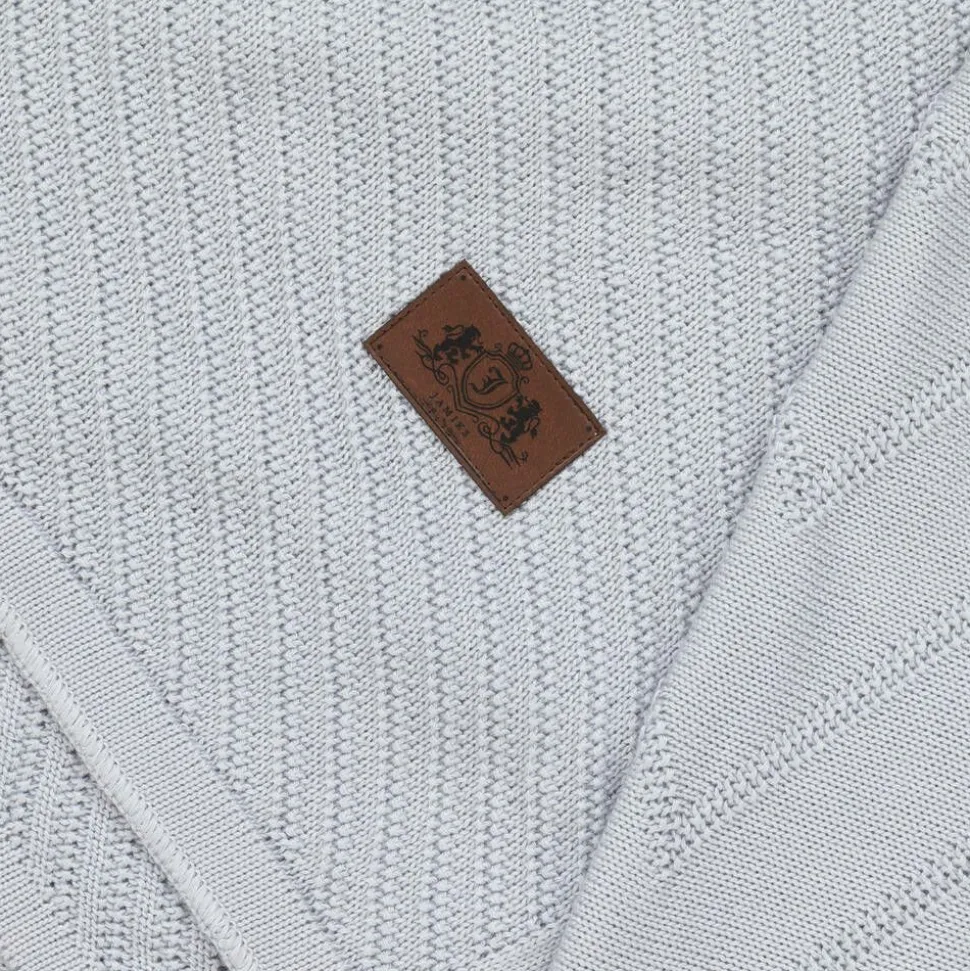 Pale grey blanket for baby boys and girls by Jamiks, made in super soft viscose. Knitted with a geometric, striped pattern, it is ideal for use in the cot or when out and about in the pram or car seat. It has a brown, eco-leather logo badge sewn on one side.