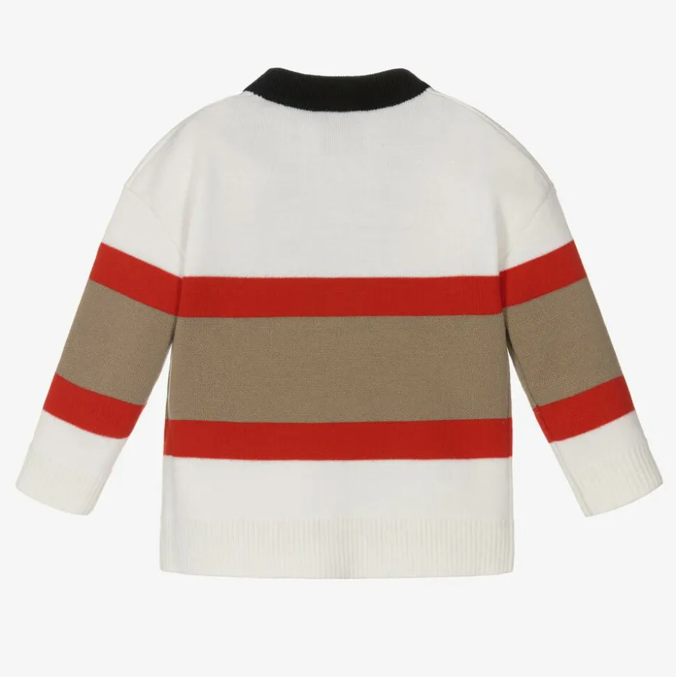 Luxury Merino wool knitted cardigan for baby girls by Burberry, styled in the designer's classic Icon stripe. Featuring bold colours of ivory, beige, red and black, this warm and stylish knit is soft and stretchy, with a silicone stamp logo at the chest and button fastenings . Responsibly sourced wool.