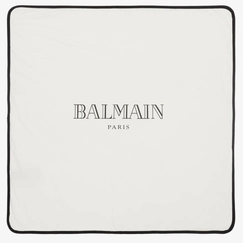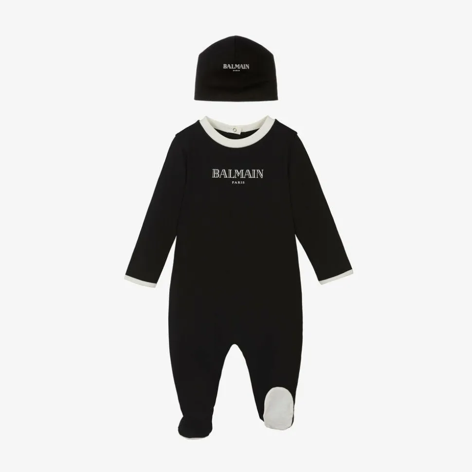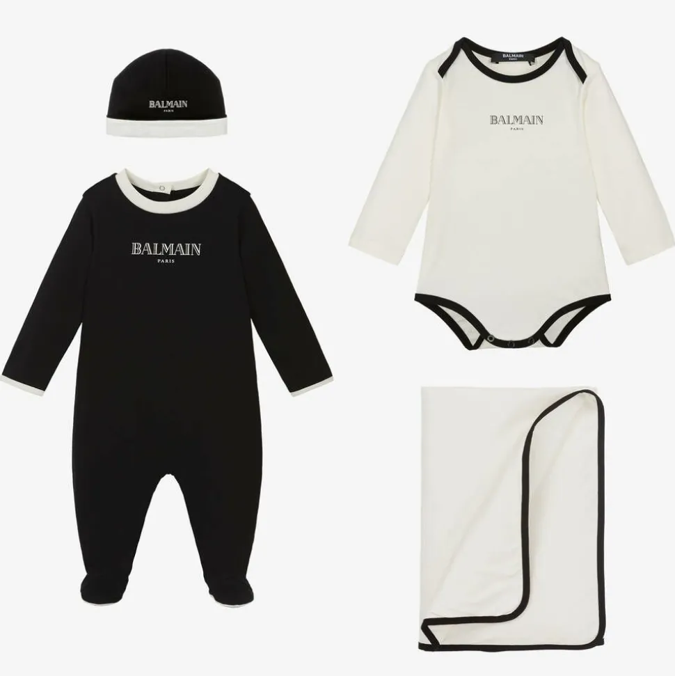 In stylish shades of ivory and black, this babysuit gift set for boys and girls is from luxury designer Balmain. Made in soft cotton jersey, the long-sleeved babygrow has sleek contrast trims and cosy enclosed feet. Poppers fasten easily on the back. The two-tone bodysuit has an easy envelope neckline and popper closures between the legs. Completing the head-to-toe look, is a matching layette hat, styled with a turned-up brim. All items, including the lightly padded jersey blanket, are printed with a statement-making Balmain Paris logo. Presented in a gift box, this four-piece set is a great choice for welcoming a little one into the world.