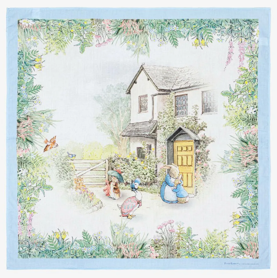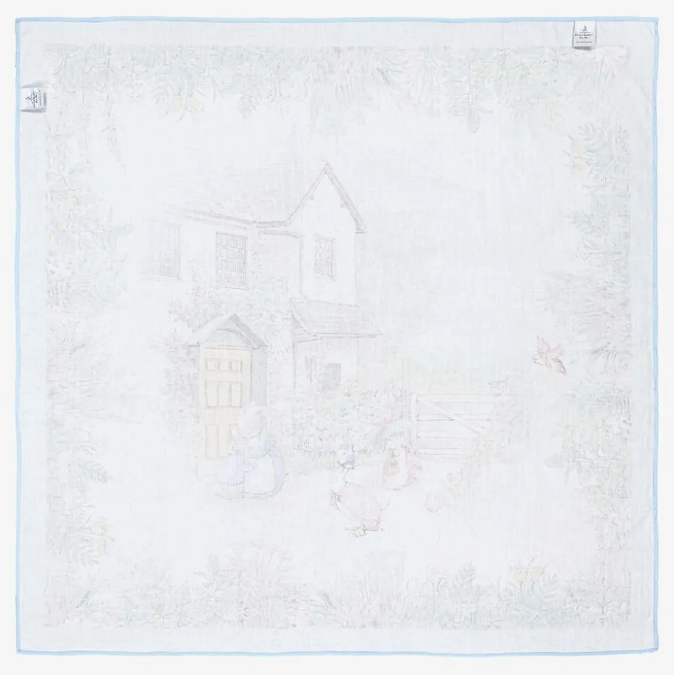 Beautiful ivory and pale blue cotton swaddle for baby boys and girls from Peter Rabbitâ„¢ by Childrensalon, printed with a charming original illustration by Beatrix Potter and a floral border. Made in soft cotton, it is breathable and lightweight, ideal for swaddling. A versatile accessory, it can also be used as a nursing cover or when out and about in the pram or car seat.