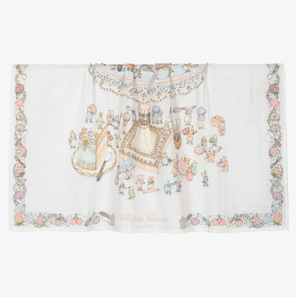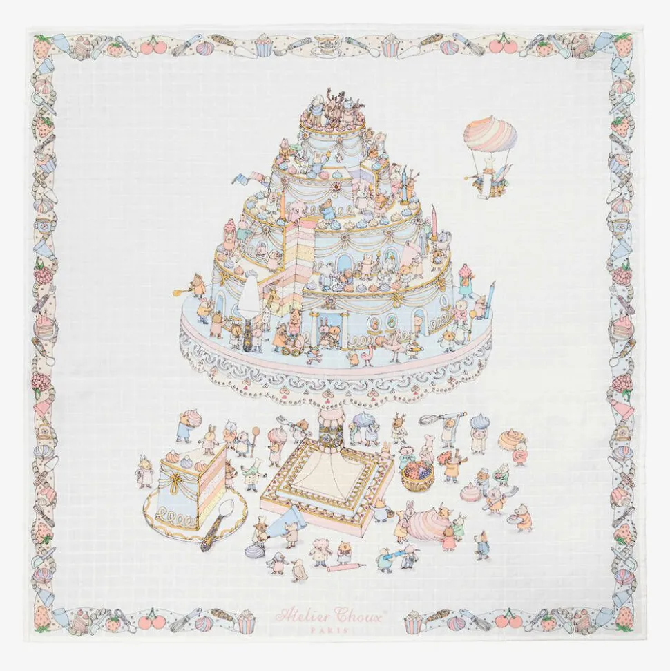 An ivory swaddle for baby boys and girls by Atelier Choux Paris, illustrated with a charming cake pattern. This lightweight muslin cloth is made from organic cotton that is delicate against baby's skin, making it lovely as a pram cover or a changing surface. Ideal for gifting to new parents, it is presented in a beautifully patterned box.