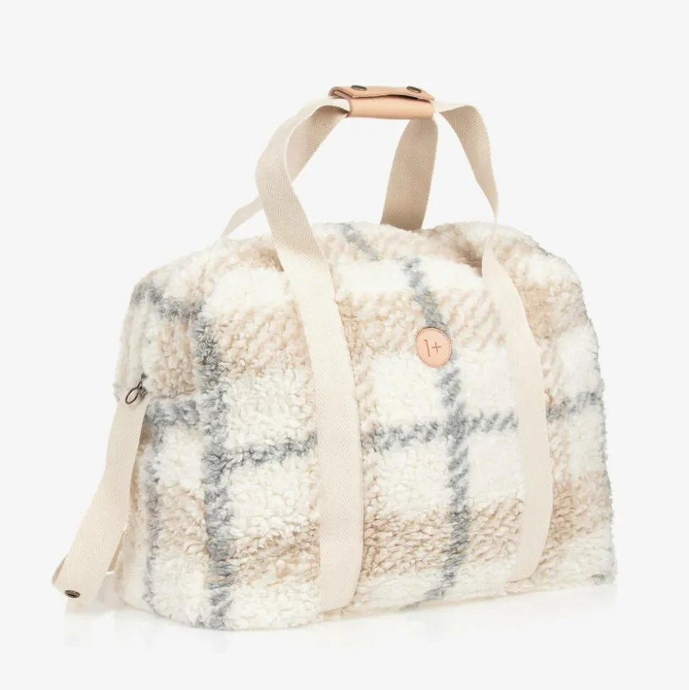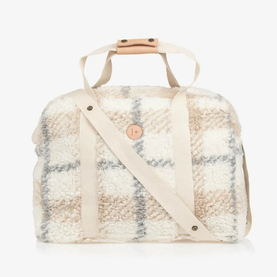 An ivory changing bag by 1 + in the family, made in soft sherpa fleece. Patterned in a charming beige and grey check design, this spacious bag is lined in soft canvas. There are three internal slip pockets and a useful zip-up pocket, ideal for organising baby's essentials. It fastens across the top with a zip and is detailed with a tan brown leather logo tab on the front. The carry handles are secured together with a popper fastening leather strap and the shoulder strap has poppers to adjust the length, allowing it to be carried on the pram or stroller.
