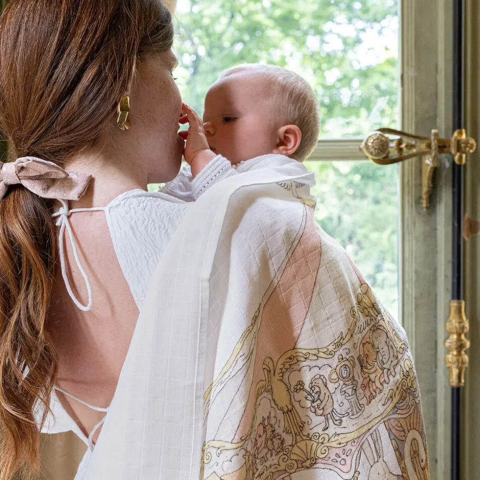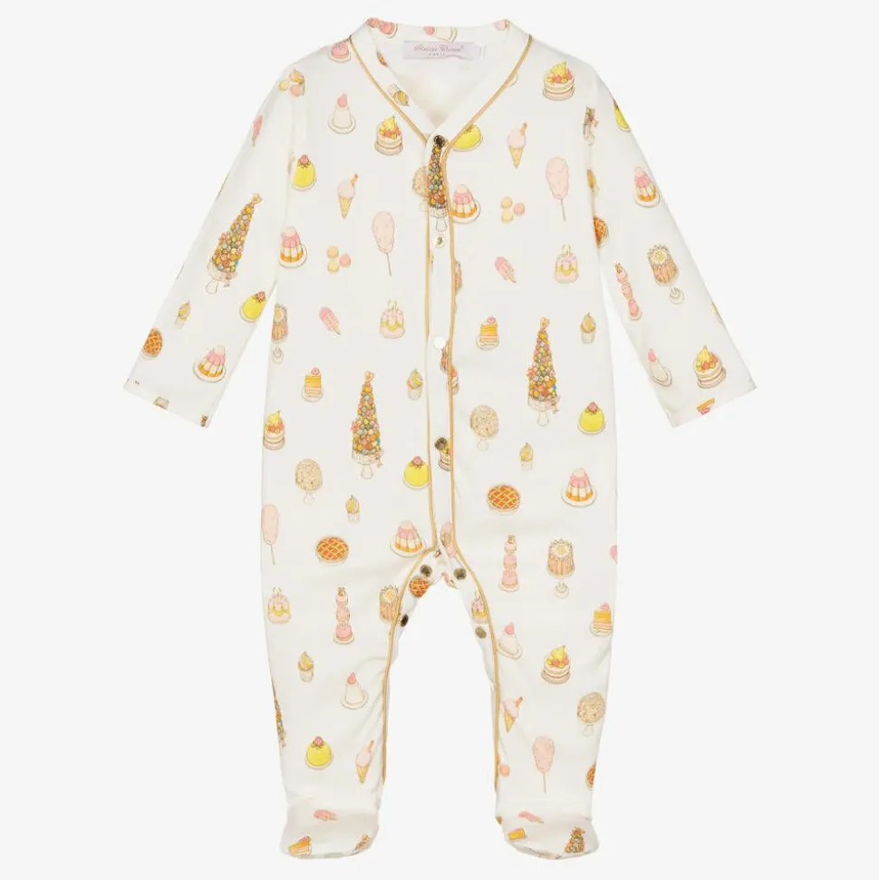 A charming, ivory babysuit set for girls by Atelier Choux Paris. Made in soft organic cotton, the swaddle blanket is illustrated beautifully with a large animal carousel in the middle. Luxurious and versatile, it can be used for swaddling or for added privacy while breastfeeding. The matching, double-sided bib has an adjustable popper fastening for an ideal fit. The soft, cotton babygrow has an all-over dessert-themed print with a smart, gold thread trim and useful gold popper fastenings. All three pieces are presented in a lovely gift box.