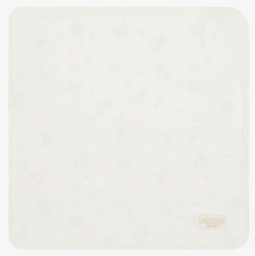 A charming ivory cotton blanket for baby boys and girls by Moschino Baby. One side is made from soft jersey and is patterned with a fun and colourful Moschino Teddy Bear logo print for a sweet look. The other side is made from a velvet-feel needlecord and is stitched with a tonal logo patch on one corner.