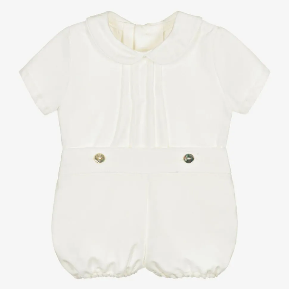 Traditional ivory shorts set by Ancar, suitable for both boys and girls. Made in a soft cotton blend, the top has a small rounded collar and pleats on the front. The shorts are elasticated at the back and around the legs cuffs for a comfortable fit. The two pieces attach to each other with buttons, so the top will always remain neatly tucked in.