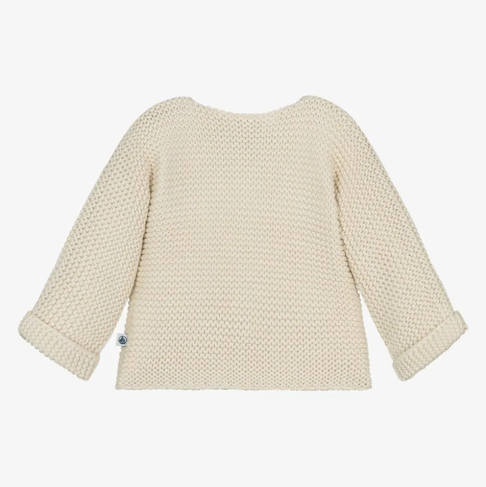 An ivory long-sleeved cardigan for baby boys and girls from French brand Petit Bateau, made in soft, chunky organic cotton knit. With a garter stitch design, this useful layering piece has turn-up cuffs and branded faux wood button fastenings on the front.