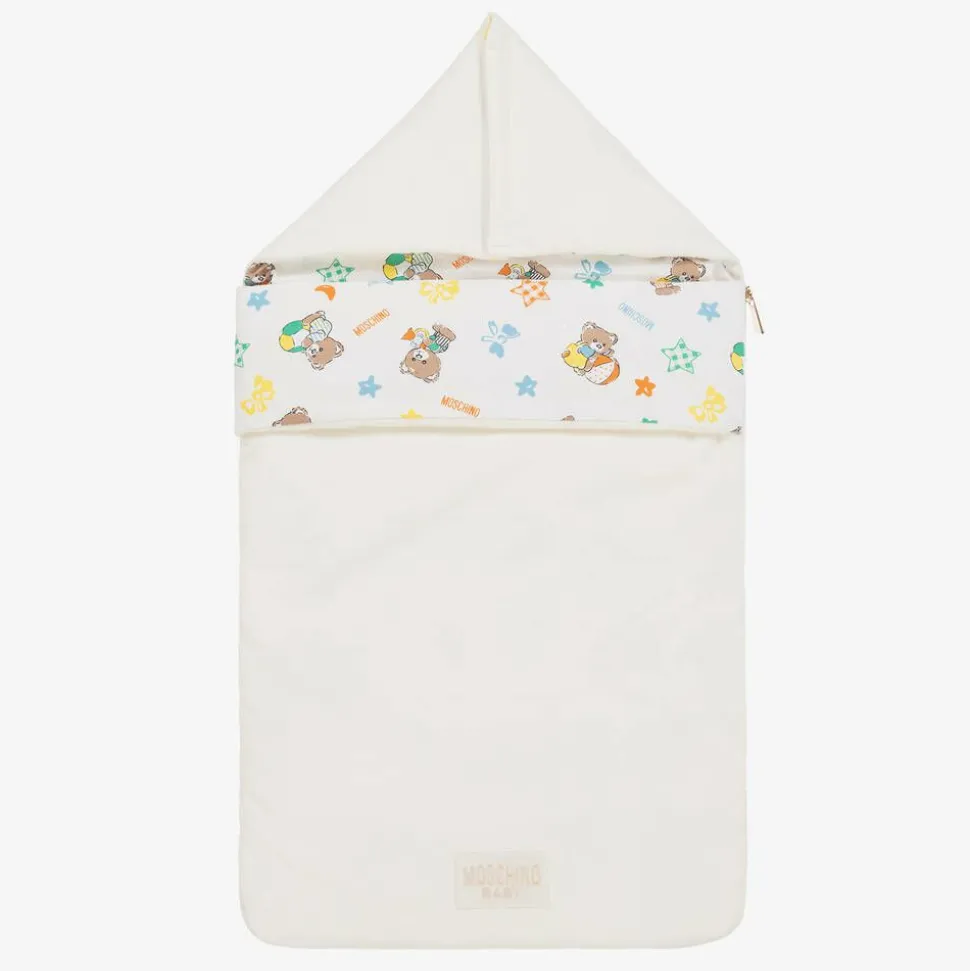 Super sweet, this ivory cotton nest for baby boys and girls is by Moschino Baby. Lightly padded, it is made from needlecord with a soft jersey lining, printed with a fun and colourful Moschino Teddy Bear logo pattern. Fastening with a zip on the side and the base, it has practical openings on the back for use in a car seat or stroller and is stitched with a tonal branded patch for a distinct finish. There are velcro strips on the hood so it can be unfastened and laid flat like a pillow.