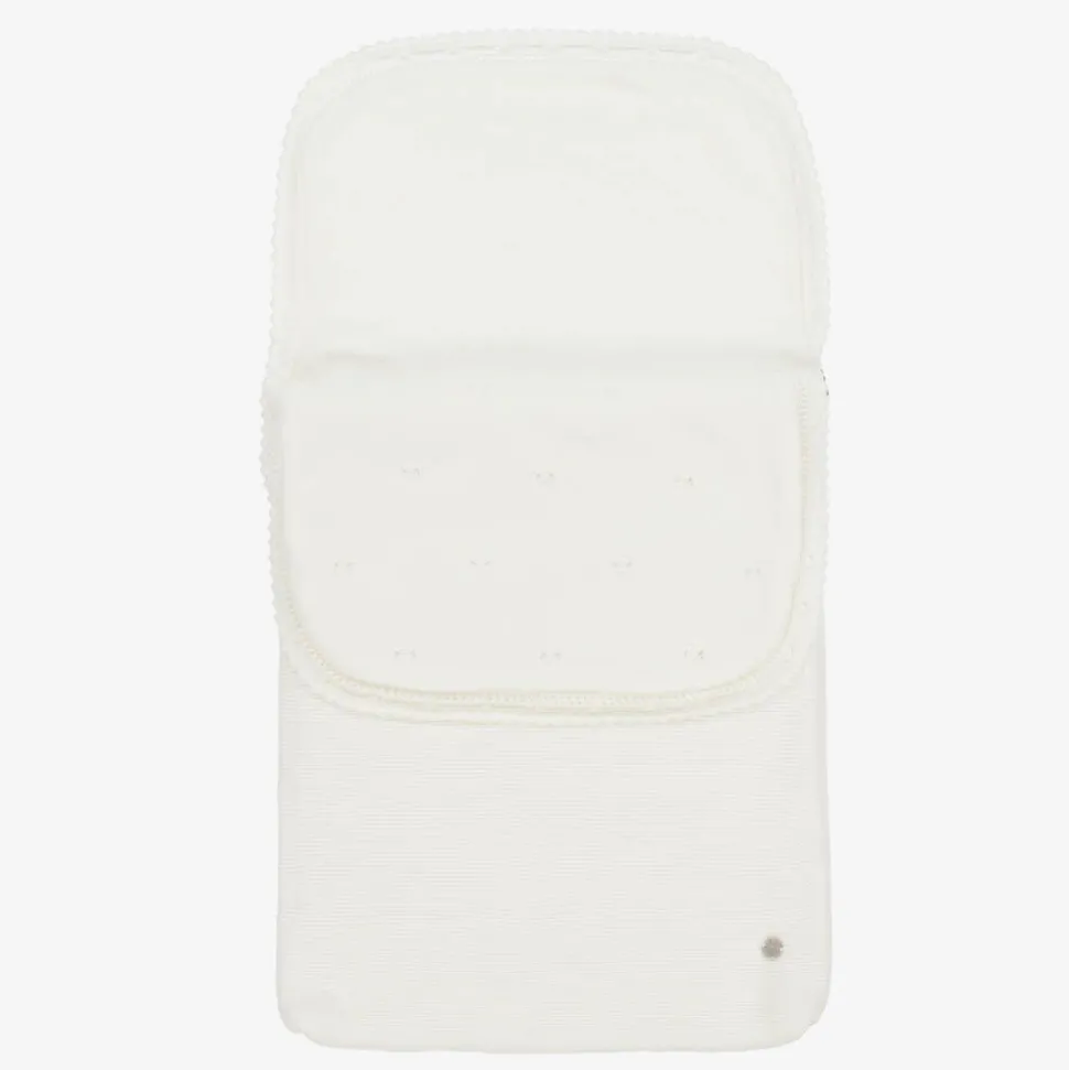 A lovely ivory knitted nest for baby boys and girls by Spanish brand, ArtesanĂa Granlei. It is lightly padded for cosy comfort and has a long side zip to easily get your little one in and out. It has a delicate pattern on the front flap, with beautiful scalloped edges, and a faux mother-of-pearl logo charm on the front.