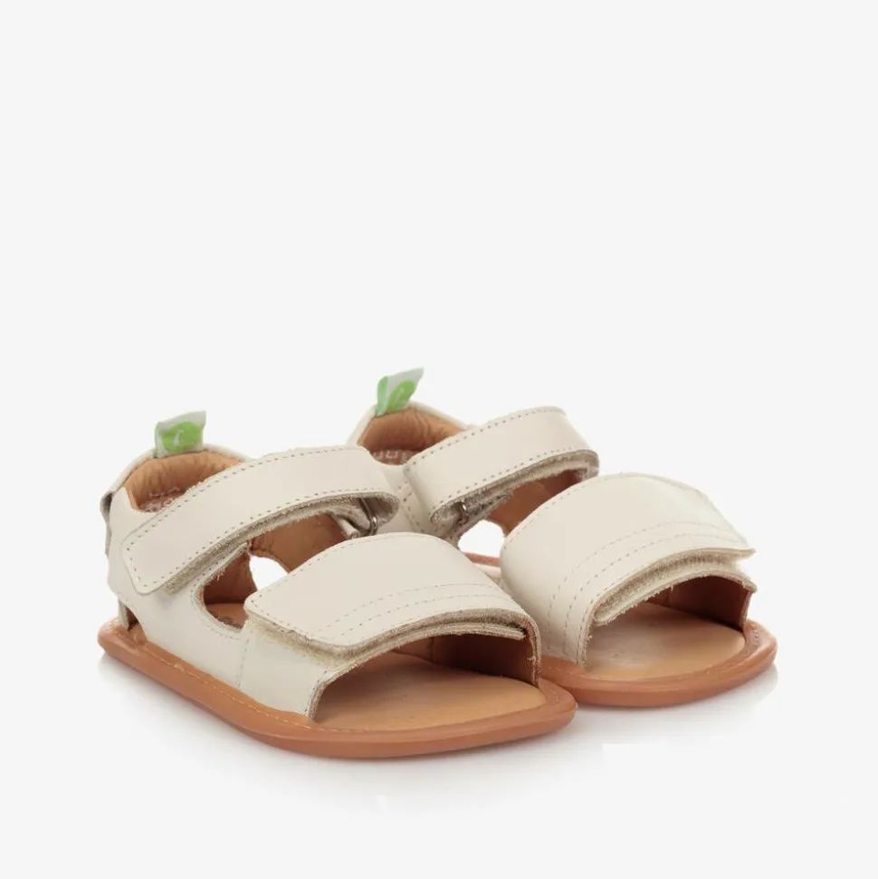 Ivory sandals for baby boys and girls by Tip Toey Joey, made in soft and supple leather with a lightly padded insole. They have a non-slip, flexible sole and a wide design that helps support the natural growth and development of little feet. They fasten with two velcro straps and have stretchy elastic around the heels to help slip them on and off.
