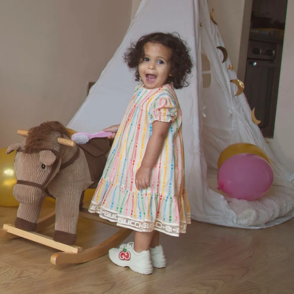 The mini version of the adult collection, these chunky-soled sneakers for girls are by luxury Italian brand Gucci. Made in ivory leather, they are printed on one side with the House's monogram logo, the red GG apple. The designer's logo is also on the tongue and back of the ankle.