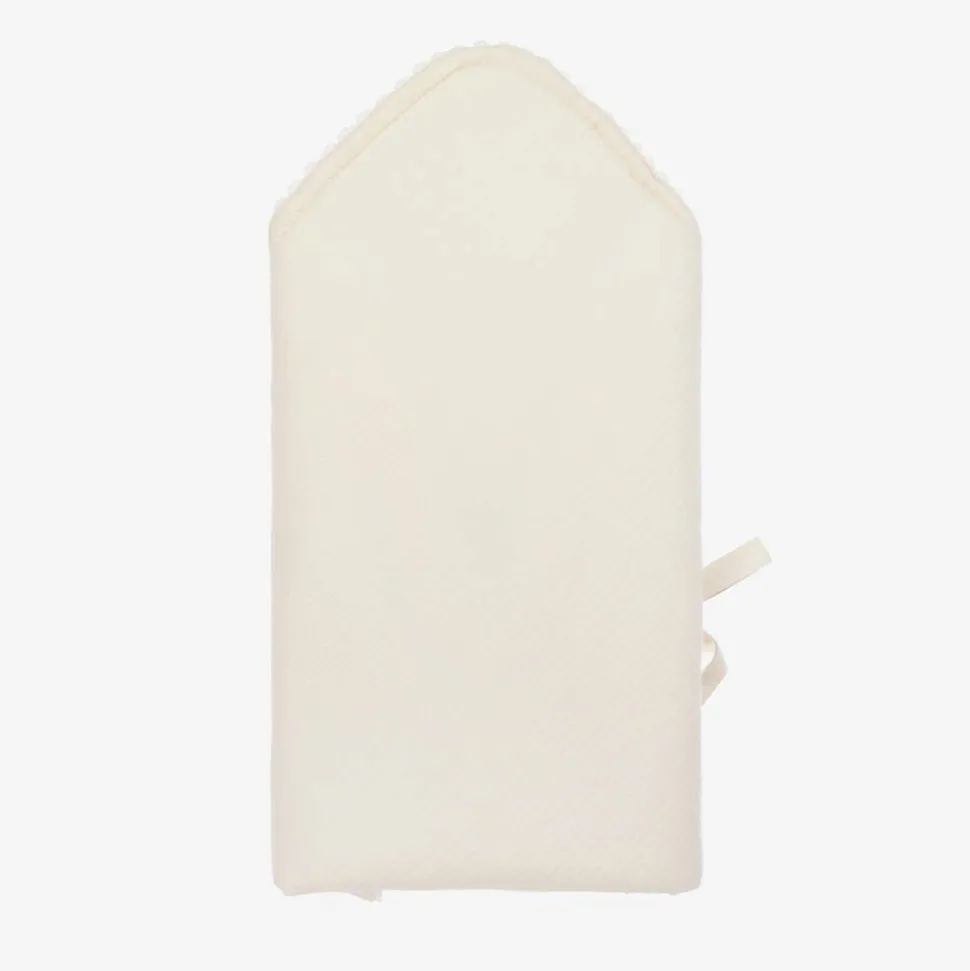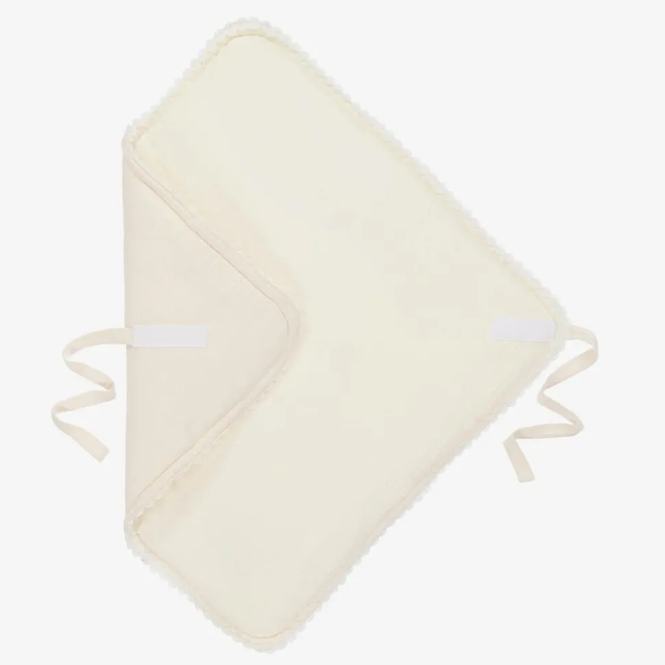 Ivory, warmly padded nest for baby boys and girls by Jamiks, with pretty, scalloped lace trims. In a wrap-around style, it is made in basket weave organic cotton, with a soft, cotton cheesecloth lining. It fastens with velcro and basket weave ties on one side. On the front is a beige logo badge.