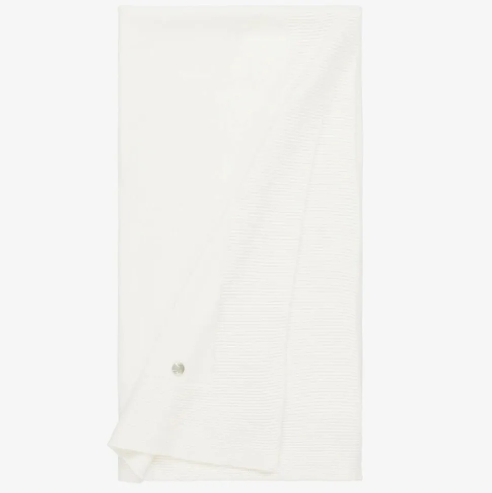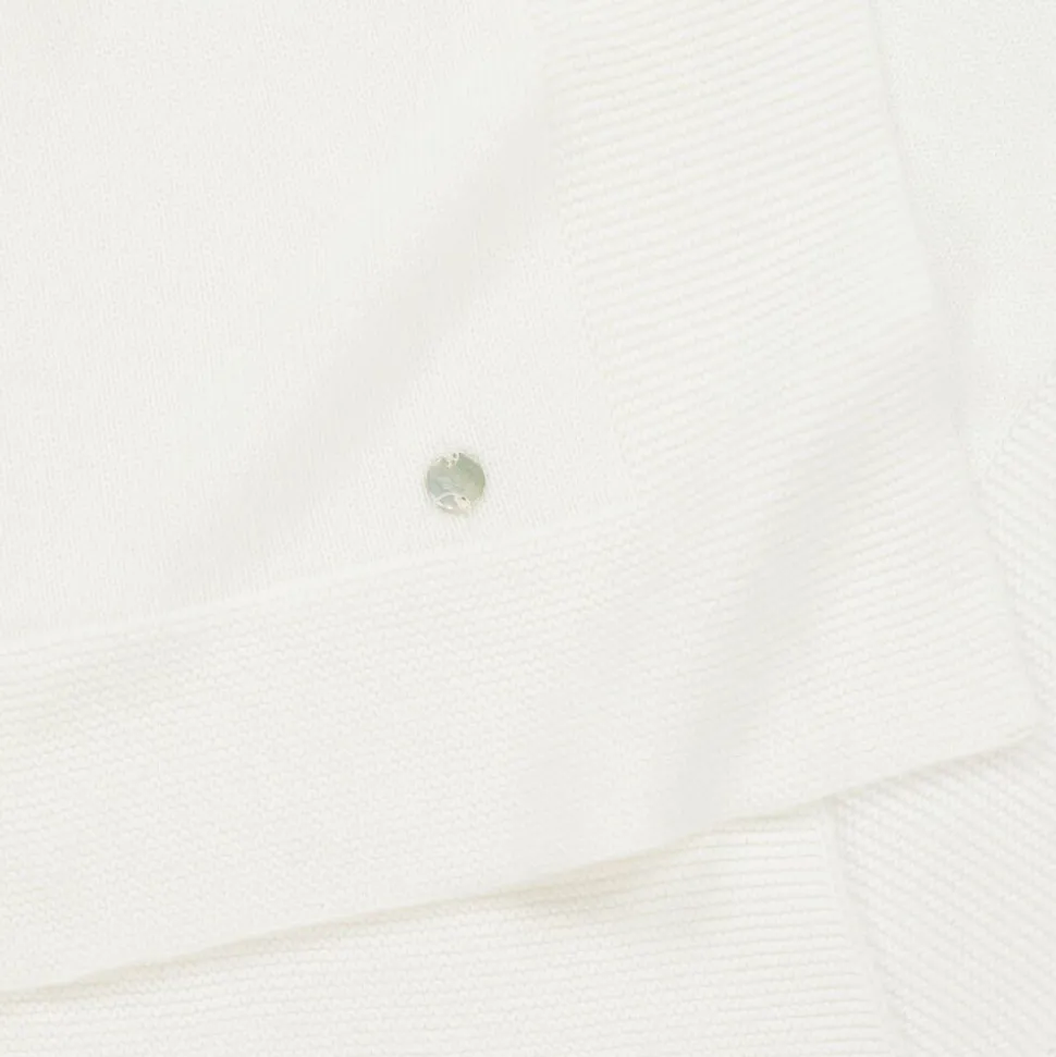 Lovely ivory blanket for baby boys and girls by Spanish brand Paz Rodriguez. Knitted in luxuriously soft organic cotton, this simply elegant design has a delicate raised knit border and a sweet mother-of-pearl logo charm.