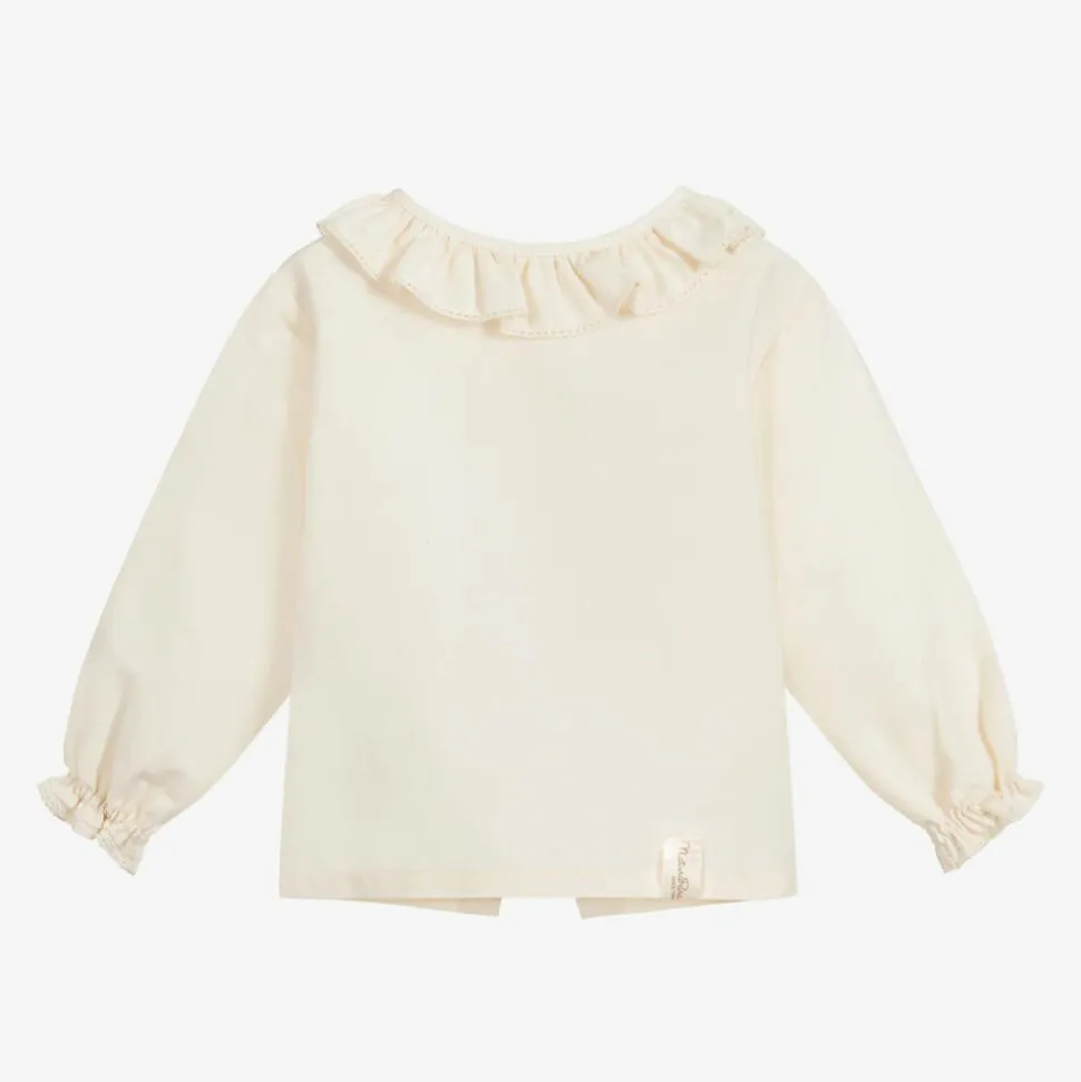 An ivory blouse for baby boys and girls by Naturapura. Soft and lightweight, this woven blouse is made from unbleached and non-dyed organic cotton. It has a round, frilled embroidered collar and gently elasticated, embroidered cuffs. With an open-back design, it fastens with a single mother-of-pearl button on the back of the neckline.