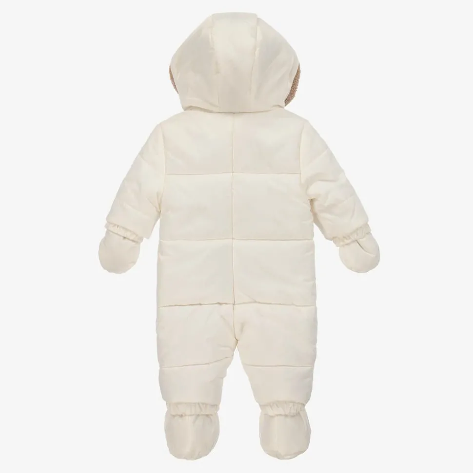 Adorable ivory quilted snowsuit for baby boys and girls from Spanish brand, Mayoral. Silky smooth and warmly padded, it has a soft and comfortable cotton jersey lining and a useful double front zip fastening. For added protection, the neck opening secures with a popper, the cuffs are elasticated and smaller sizes come with detachable mittens and booties. To complete the cute look, there is an appliqué teddy bear face on the front in soft beige teddy fleece, with matching trim on the hood.