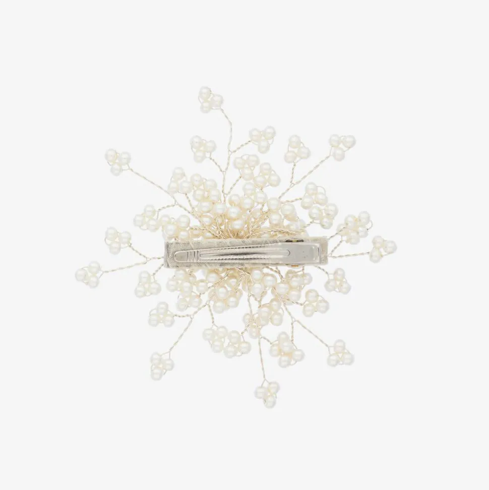 Ivory handmade hair clip for girls by Sienna likes to party. This beautiful accessory is detailed with shimmering ivory pearl beads and silver metal wirework on a satin-wrapped crocodile clip.