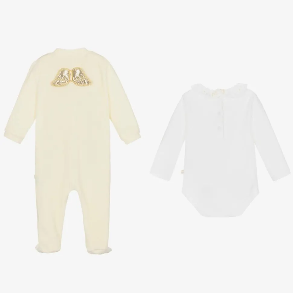 Super cute babygrow and bodysuit gift set for baby boys, designed by the Greek princess Marie-Chantal. The soft ivory cotton velour babygrow has the brand's signature Angel Wings on the back, padded and shimmering in gold. It fastens with easy-to-use poppers on the front and between the legs and comes with a white bodysuit made in beautifully soft Pima cotton jersey. It has a ruffled poplin collar delicately embroidered with gold Angel Wings and fastens with poppers on the back and between the legs, so never becomes untucked.
