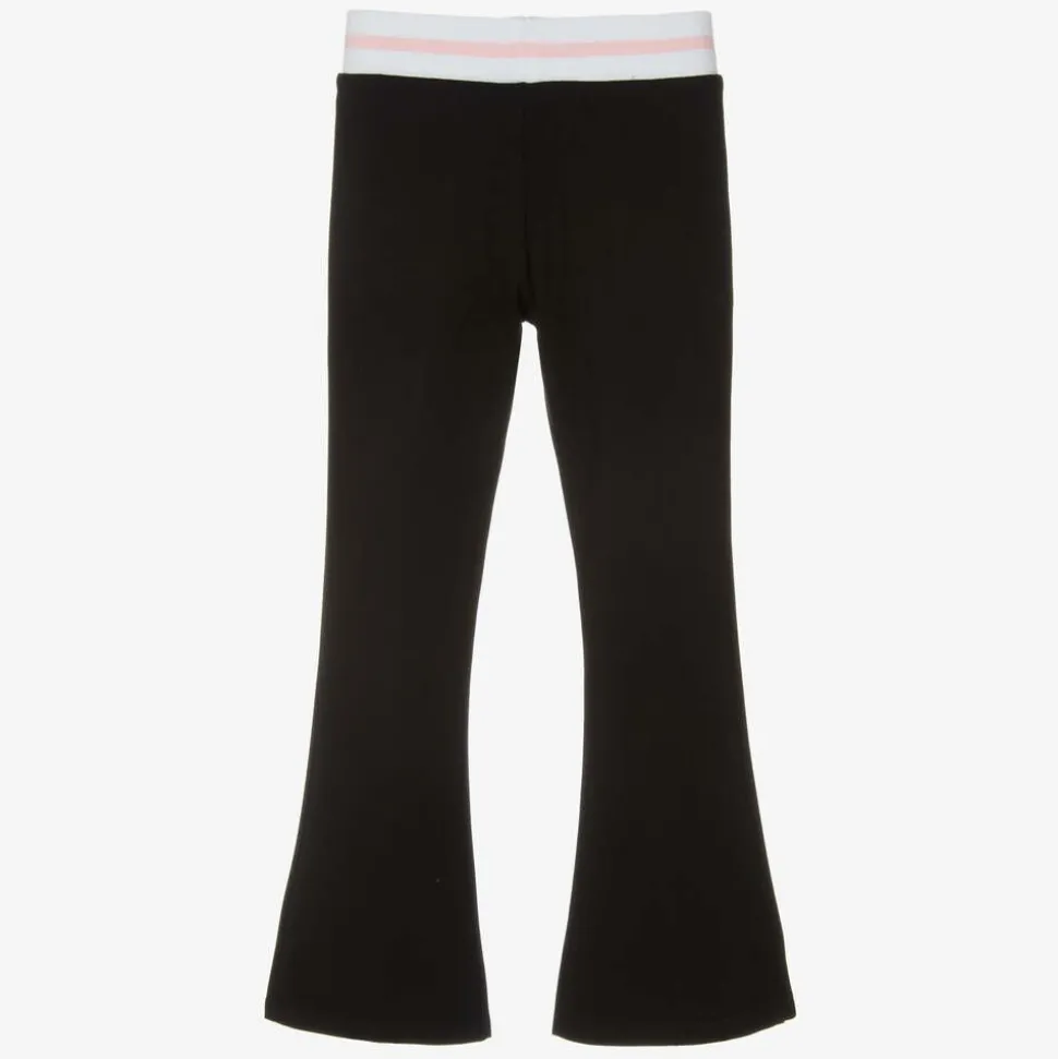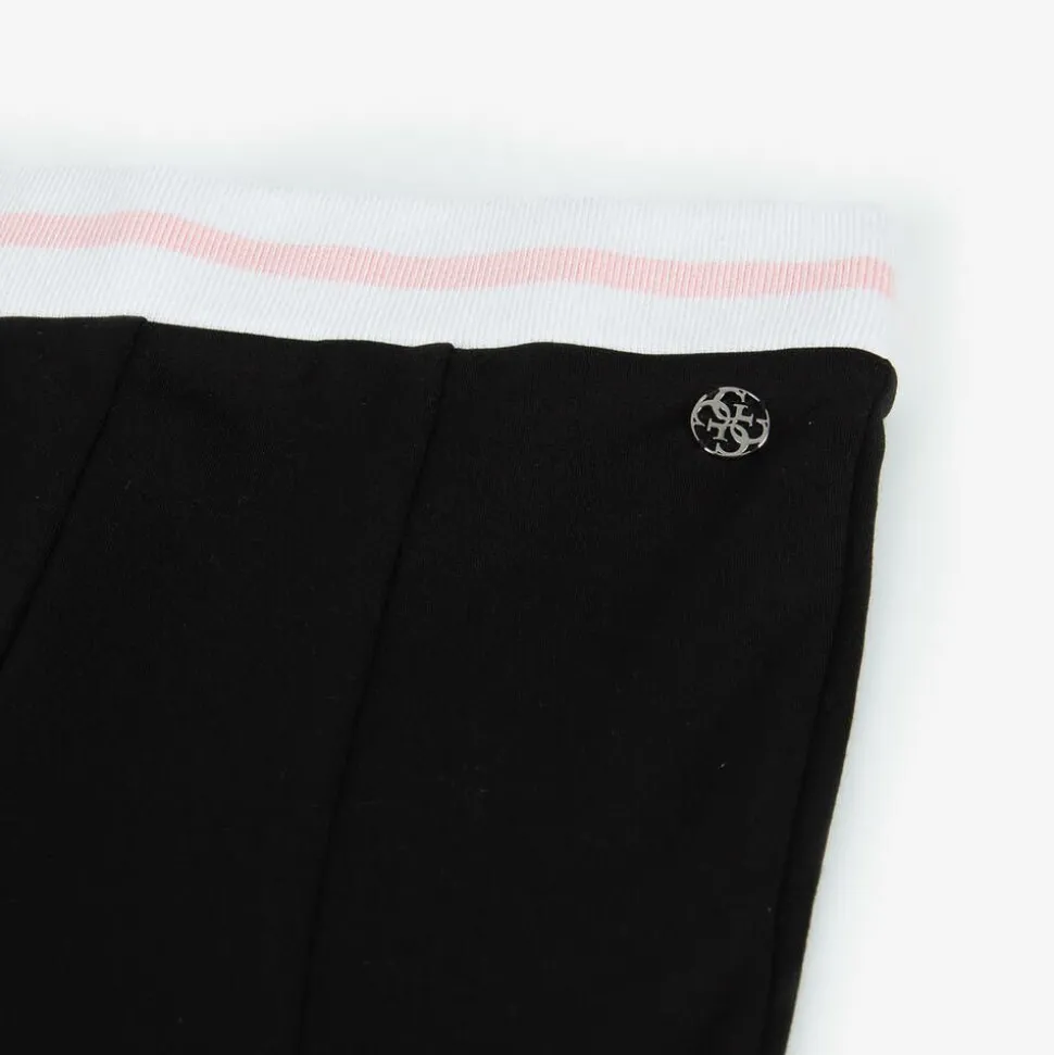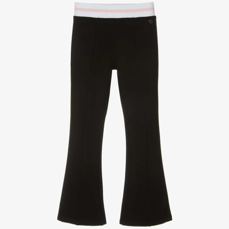 Both comfortable and stylish, these black viscose jersey trousers for junior girls are by Guess. They are flared in style, with central seams on the legs and a 4g logo charm sewn on one side. The white elasticated waistband is striped in pink.