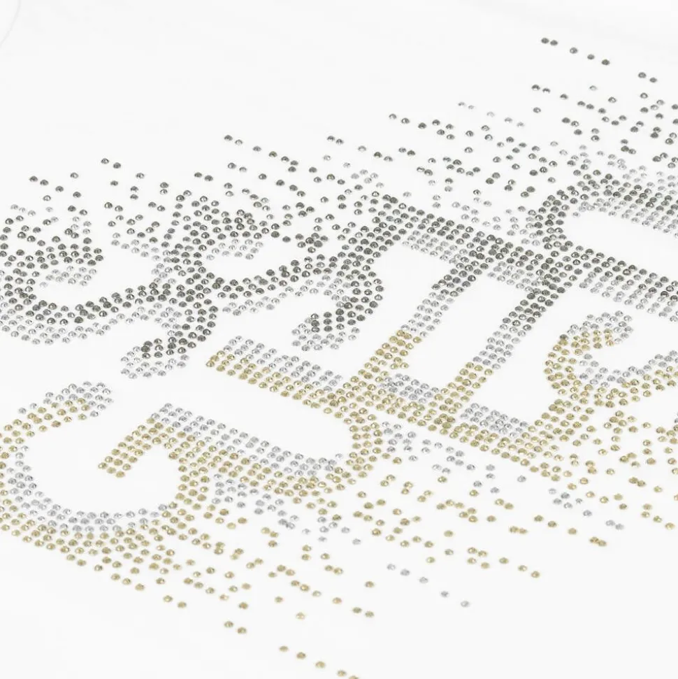 A white cotton T-shirt for junior girls by American brand Guess, with a sparkling gold and silver diamanté logo on the front. Made in soft and comfortable jersey, it is casually styled with a crew neckline and a relaxed, boxy fit. This product contains organic cotton fibres.