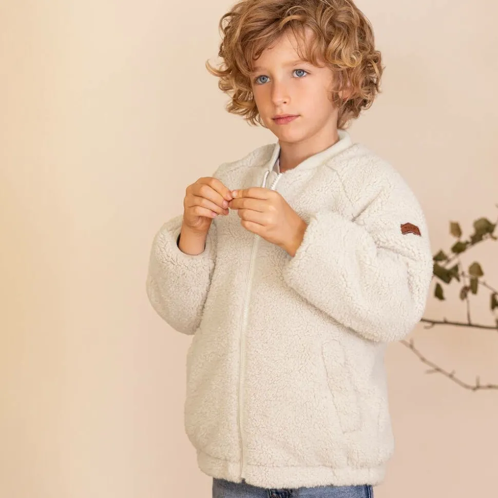 A 2-in-1 khaki green and ivory coat for boys and girls by British brand Töastie, made from sustainably recycled materials. The practical green waterproof shell has reflective trims, taped seams, and a zip and popper fastening placket. The pockets are fleece-lined and secure with poppers, and the elasticated hood is jersey-lined for warmth. Adding versatility to this style, the sherpa bomber jacket can be worn separately or attached to the coat and used as an extra layer. Both coats feature the brand's logo badge on the sleeve.