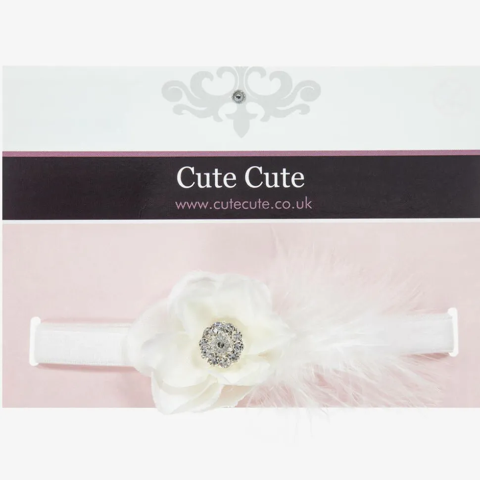 A lemon yellow and white satin flower by Cute Cute, with feather and diamanté. The headband is made from comfortable, soft elastic.
