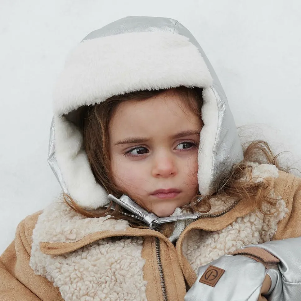 A silver trapper hat for little boys and girls by Elodie, made in grained faux leather with a metallic sheen. Great for the colder weather, this timeless design is gently padded and fully lined with warm teddy fleece. The ear flaps can be fastened securely under the chin for protection against the cold winds.